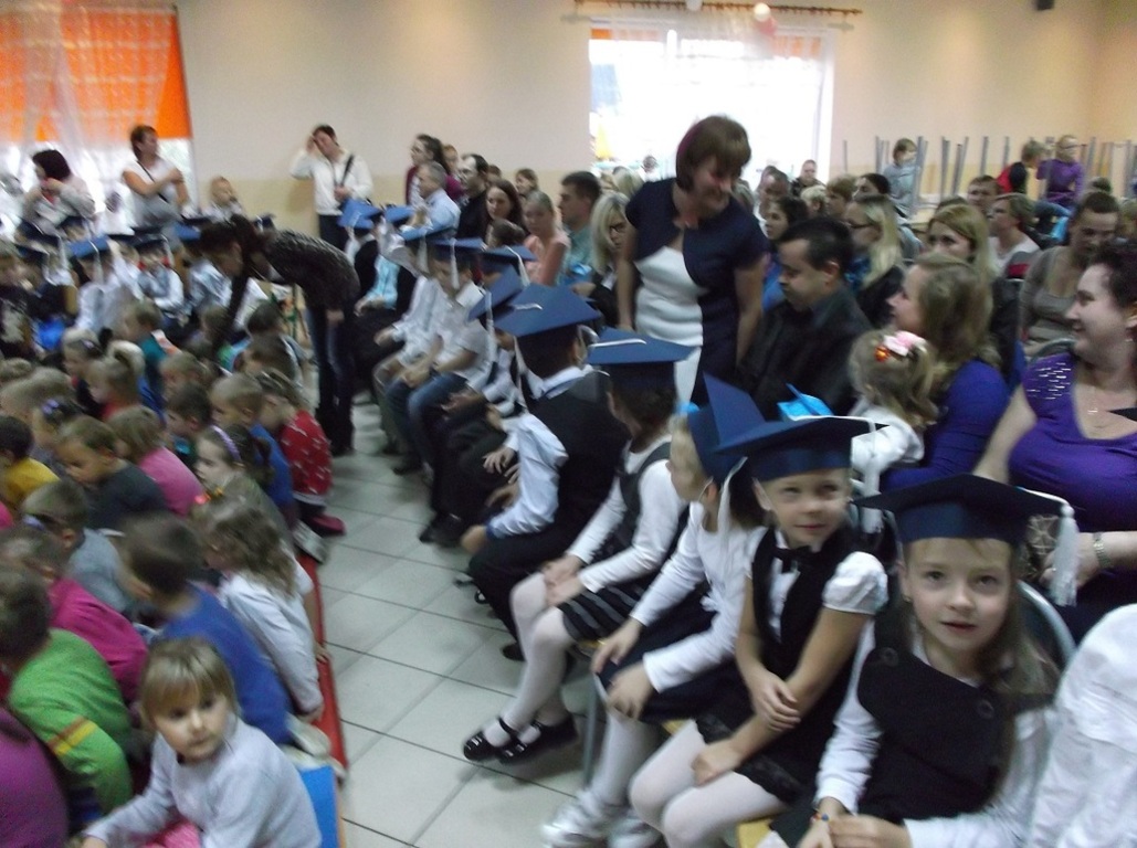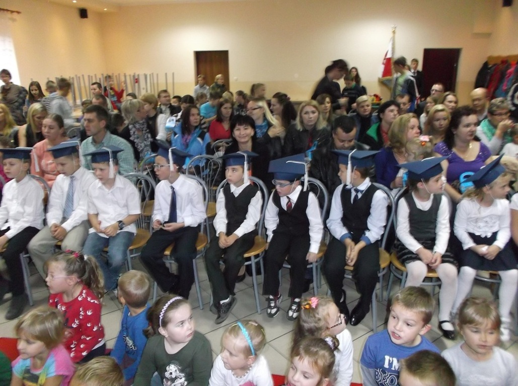 Uczniowie klas I w obecności swoich starszych koleżanek i kolegów, nauczycieli, rodziców i gości pasowania byli przez panią dyrektor na uczniow "Szkoły Podstawowej im. Jana Pawła II w Skorzewie".