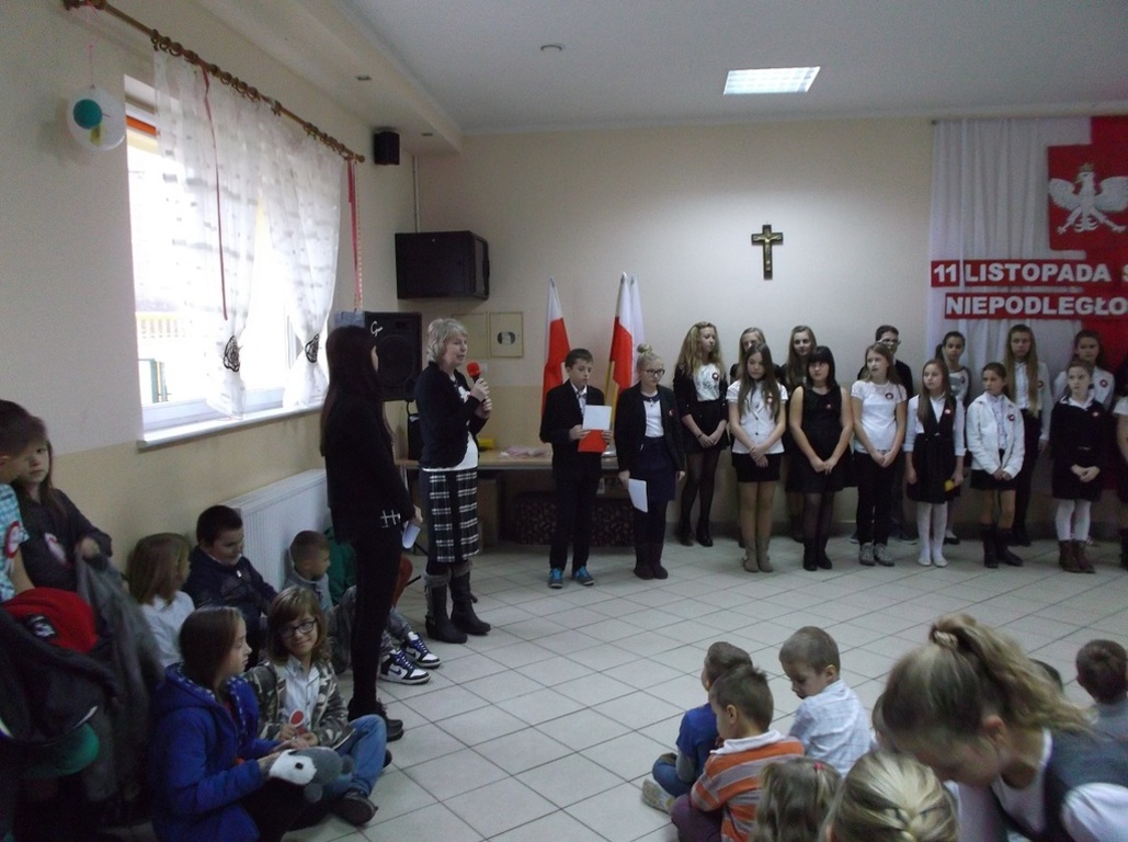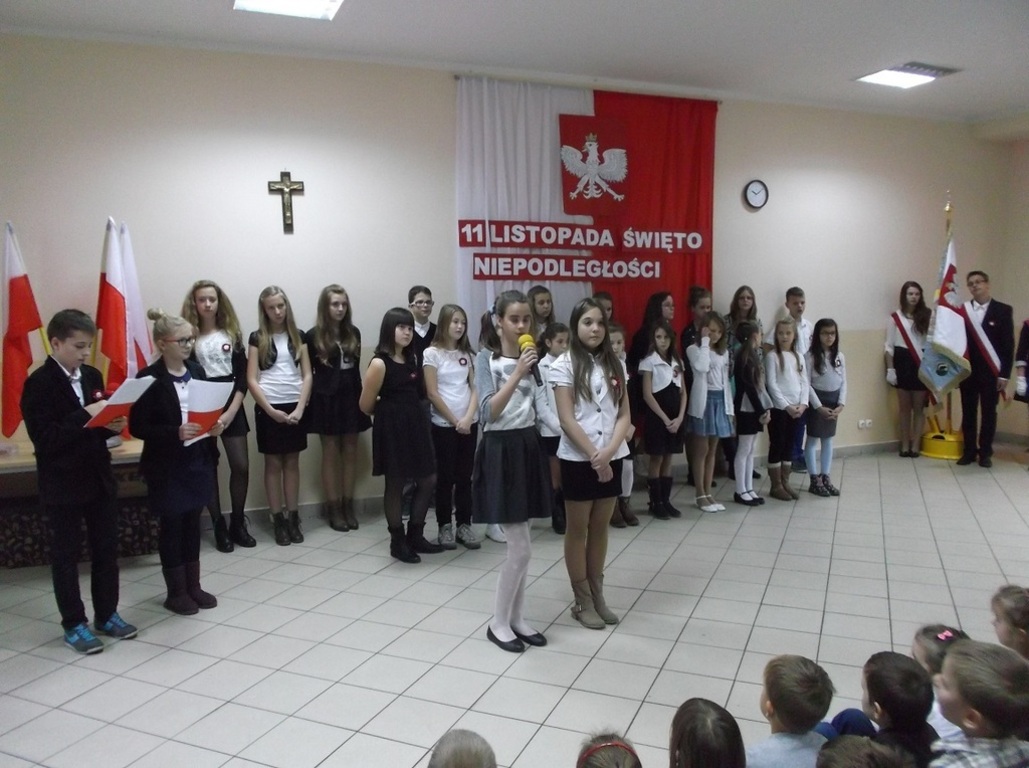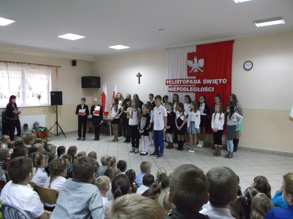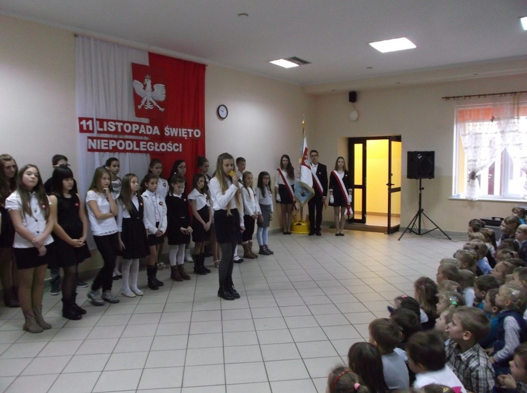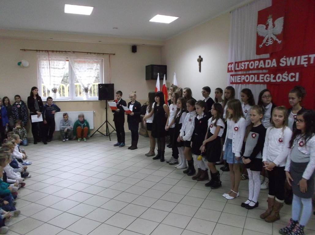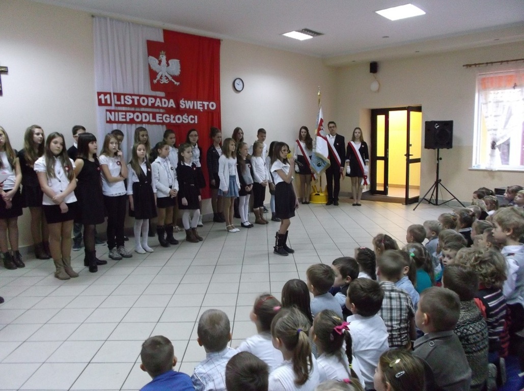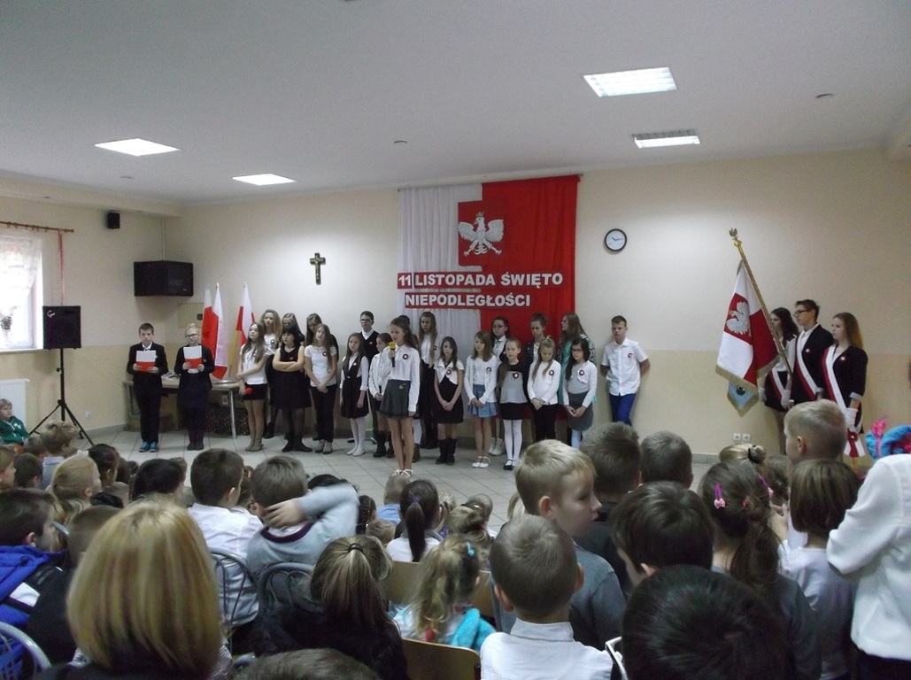 Dnia 13 listopada w naszej szkole odbył się uroczysty apel z okazji Święta Niepodległości. Uczniowie Szkoły Podstawowej aktywnie wzięli udział w uroczystości wprowadzającej w atmosferę wydarzeń poprzedzających datę 11 listopada 1918 roku. W skrócie zobrazowano sytuację polityczną kraju, jaka miała miejsce przed odzyskaniem przez Polskę niepodległości. Jednak największy nacisk położono na ukazanie ducha narodu polskiego, który w czasie 123 lat niewoli, stale wychodził z inicjatywą walki za ojczyznę. Przypomniano daty trzech najważniejszych powstań narodowych, podkreślając wkład najmłodszych ich uczestników. Natomiast interpretacje muzyczne i recytatorskie utworów literackich pozwoliły zrozumieć rozterki i uczucia walczących o niepodległość.