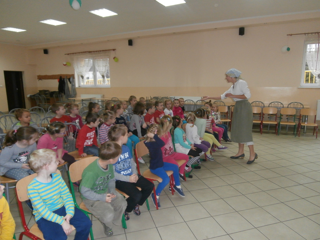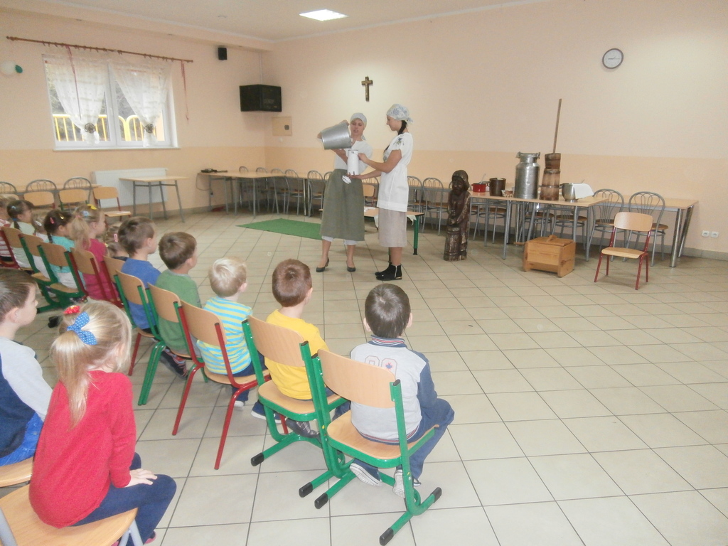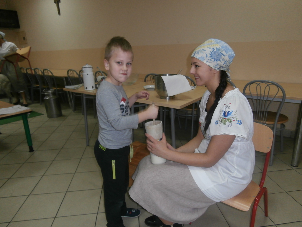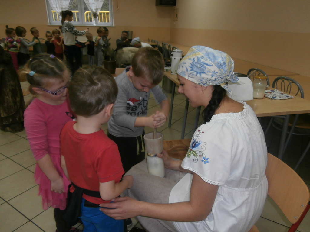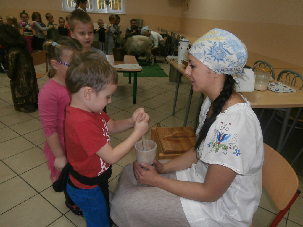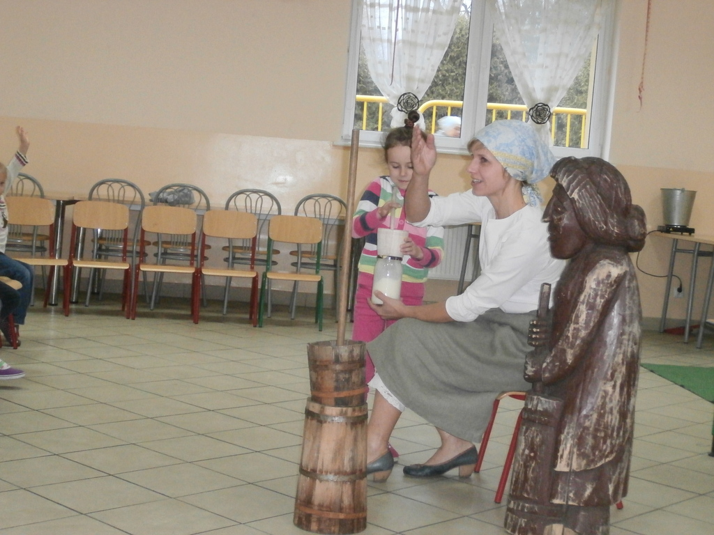 Po prezentacji bajki ,,Bajka o maśle i żabce”, zapoznały się z gospodarczym procesem powstawania twarogu i masła. Samodzielnie wykonały masło w małej, specjalnie w tym celu skonstruowanej maselnicy.