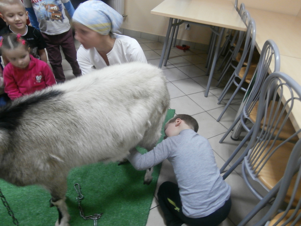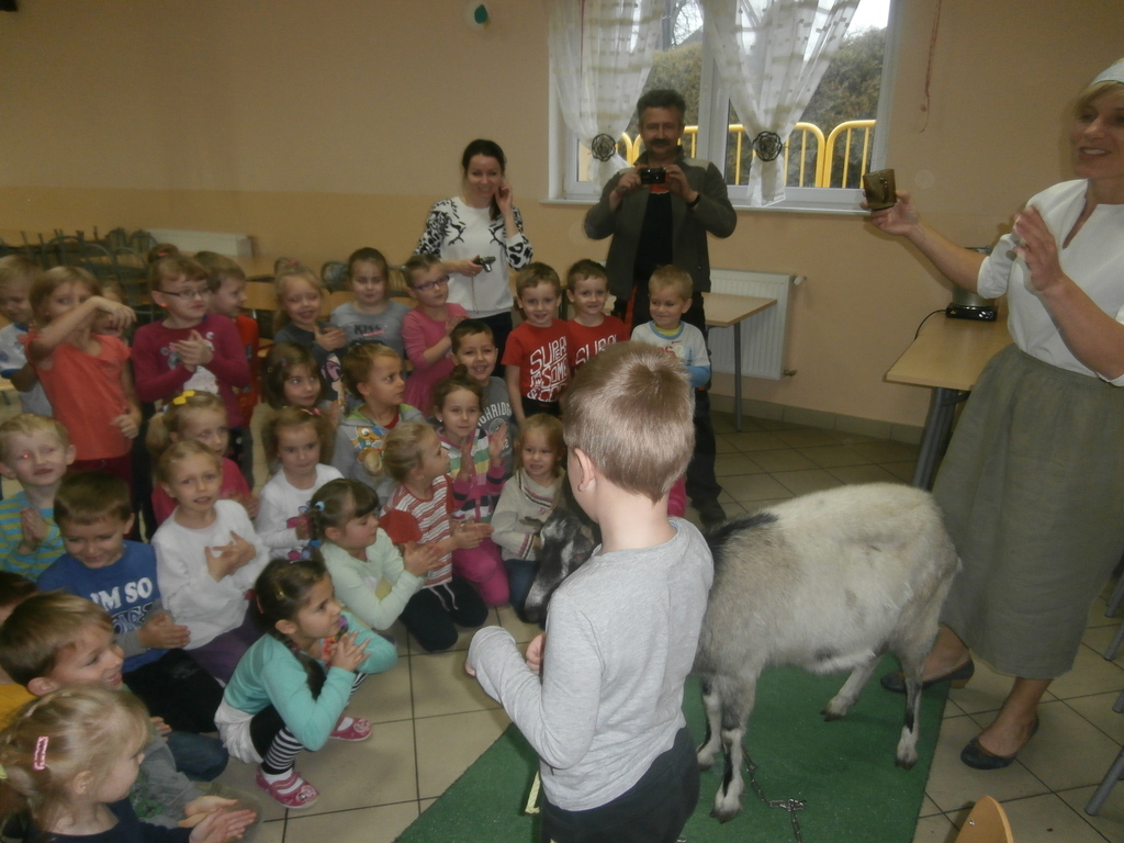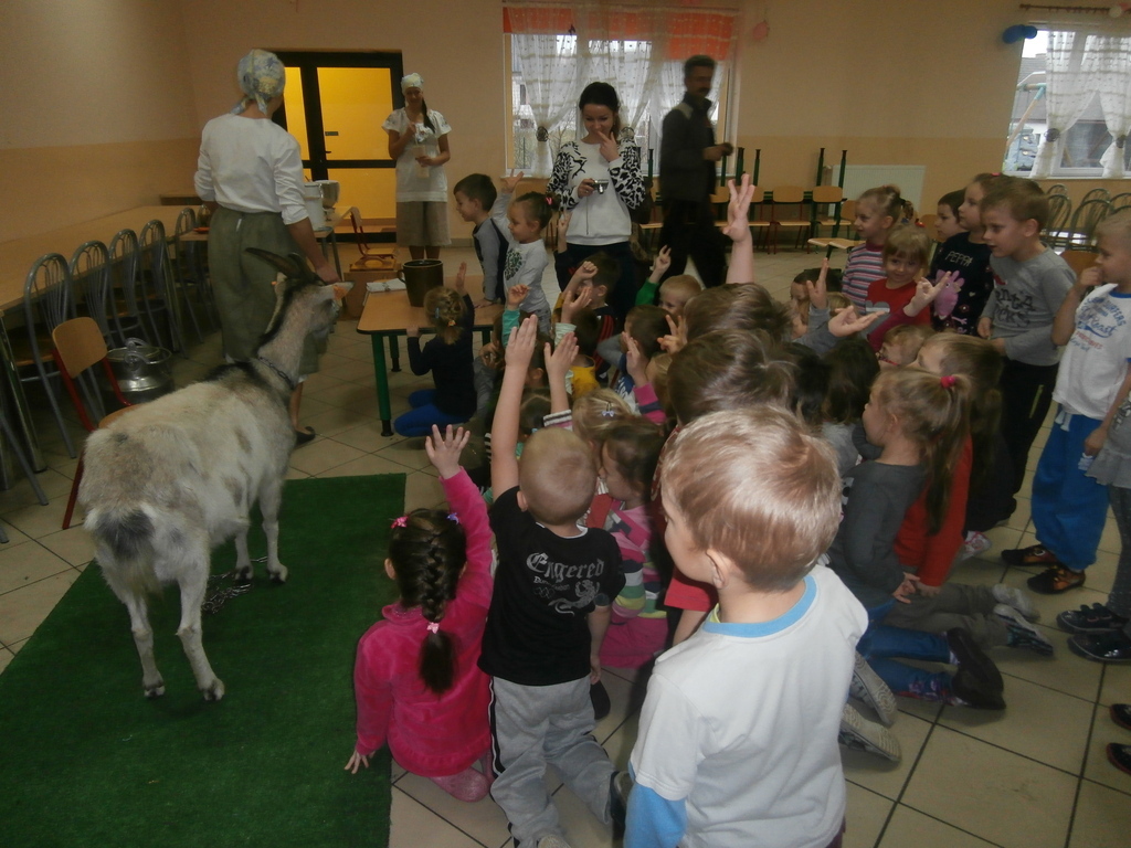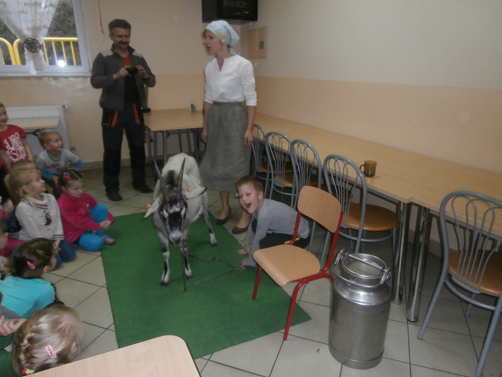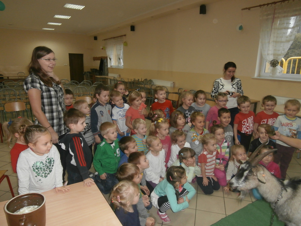 Dnia 25.11.2014 r. wszystkie dzieci z naszego przedszkola uczestniczyły w spotkaniu edukacyjnym pt. ,,Mleczna droga”. Dzieci miały okazję obserwować karmienie kozy, pokaz ręcznego dojenia kozy a chętne maluchy same mogły wykonać tę czynność.