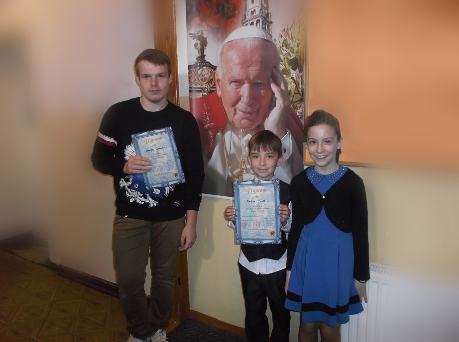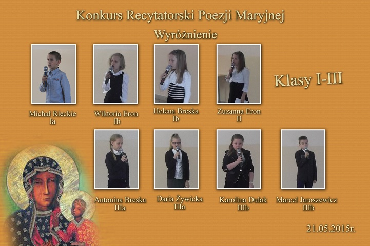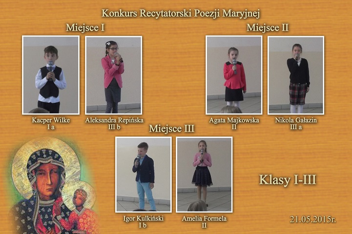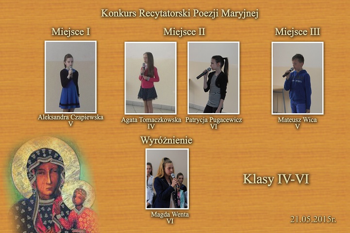 W maju odbył się w Kościerzynie Diecezjalny Konkurs Poezji Maryjnej. Naszą szkołę reprezentowali: z klasy I-III Kacper Wilke, IV-VI- Aleksandra Czapiewska, z gimnazjum Patryk Zmuda, który zdobył wyróżnienie i nagrody księdza Proboszcza M. Szczepińskiego.