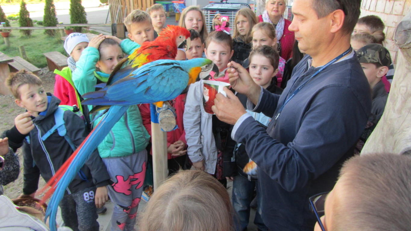 Ostatni dzień września czwartoklasiści ze Skorzewa spędzili na wycieczce integracyjnej do Tuchlina. Czekało tam na nich mnóstwo atrakcji. Najpierw zaskakujące powitanie zgotowały im dwie papugi ary , Daria i Jasiek , które swobodnie latały nad terenem parku i pozwoliły się karmić łyżeczką. Obie przylatywały na zawołanie i siadały na ramieniu opiekuna. Duże wrażenie na uczniach wywarł też Didżej, papuga kakadu uwielbiająca muzykę i kradnąca telefony komórkowe....