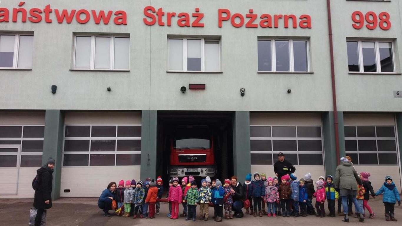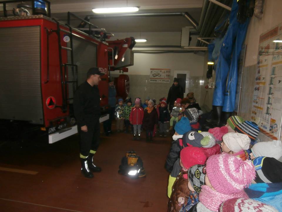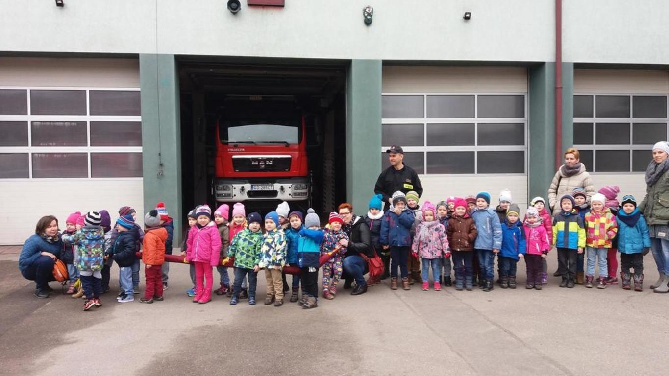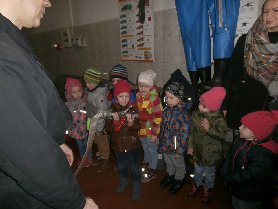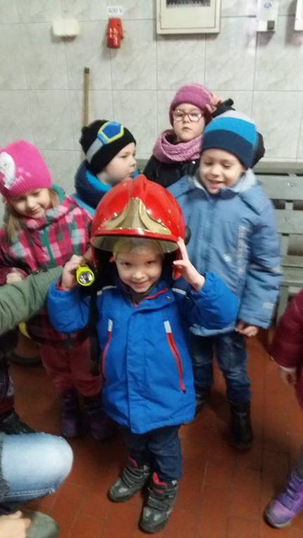 Na wycieczce został zaprezentowany sprzęt pożarniczy stanowiący wyposażenie jednostki Straży Pożarnej. Oglądaliśmy różnorodne wozy strażackie, sprzęt do gaszenia pożarów. Dzieci mogły usiąść za kierownicą, przymierzyć hełm strażacki, spróbować potrzymać wąż strażacki. Dzieci utrwaliły sobie numer telefonu do Straży Pożarnej - 998 i numer alarmowy – 112. Następnie dzieci wybrały się na plac zabaw ,,Zuzoland”, tam na dzieci czekało mnóstwo atrakcji: baseny z kolorowymi piłkami,