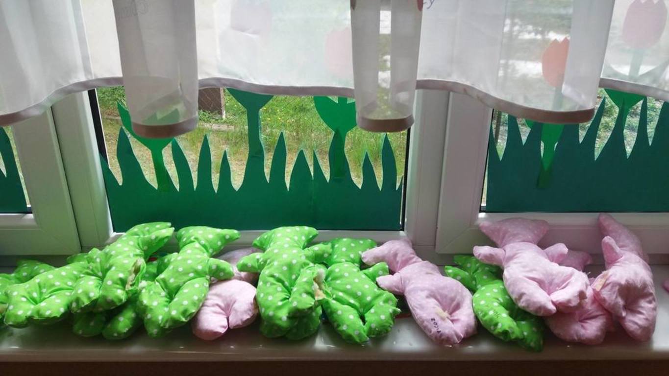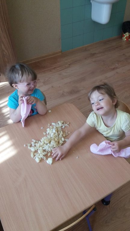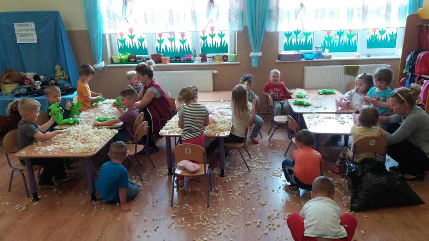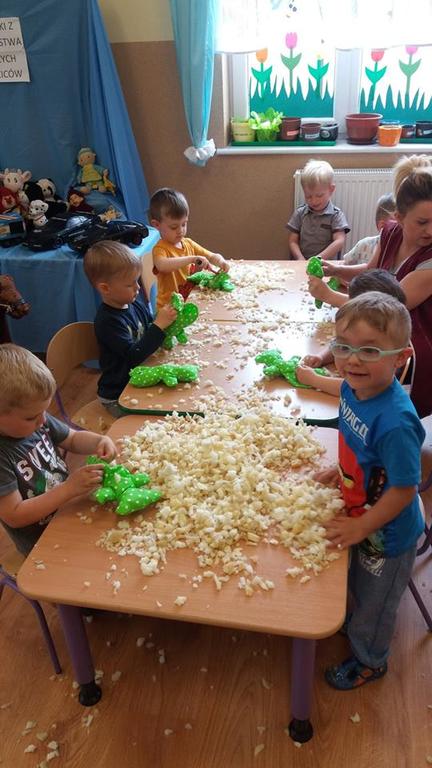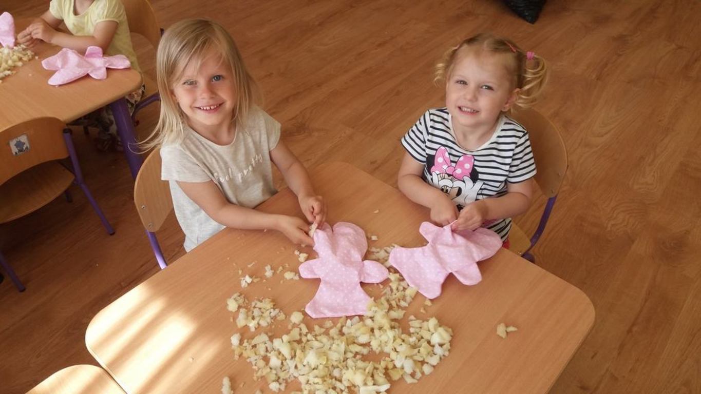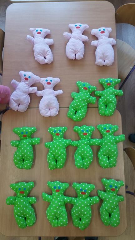 Po krótkim wprowadzeniu dzieci w świat ,,dawnych” zabawek, przystąpiliśmy do szycia misiów. Mama Nataniela przyniosła maluchom wstępnie przygotowane przez siebie maskotki. Maluszki miały za zadanie uzupełnienia środka pluszaka, przyklejenia oczu i buźki. Tak przygotowane maskotki dzieci zabrały do domu.