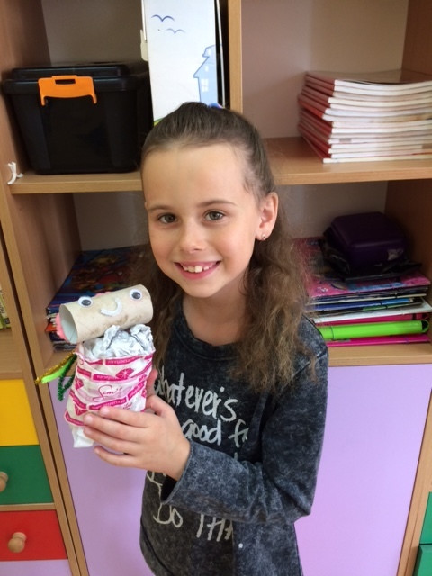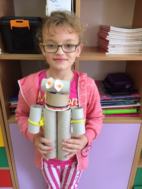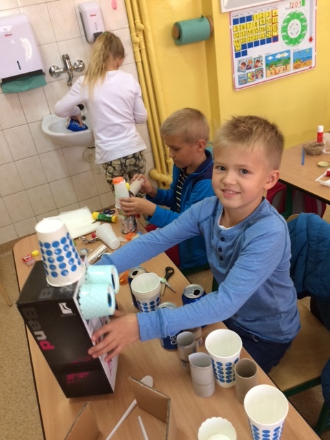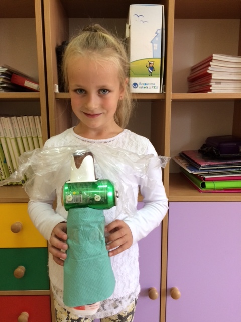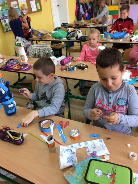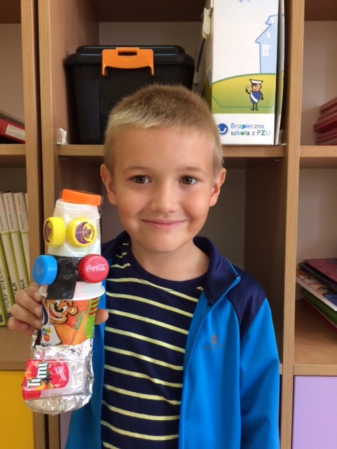 Uczniowie do swoich prac wykorzystali makulaturę, plastikowe nakrętki , folię , rurki itp.