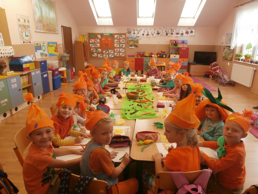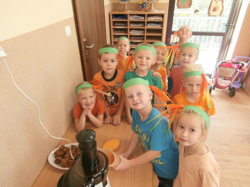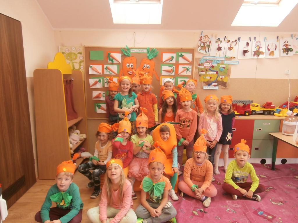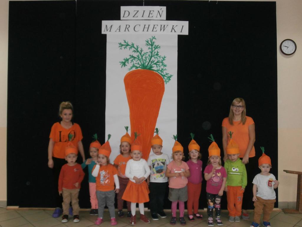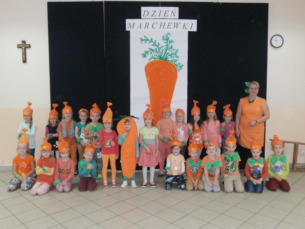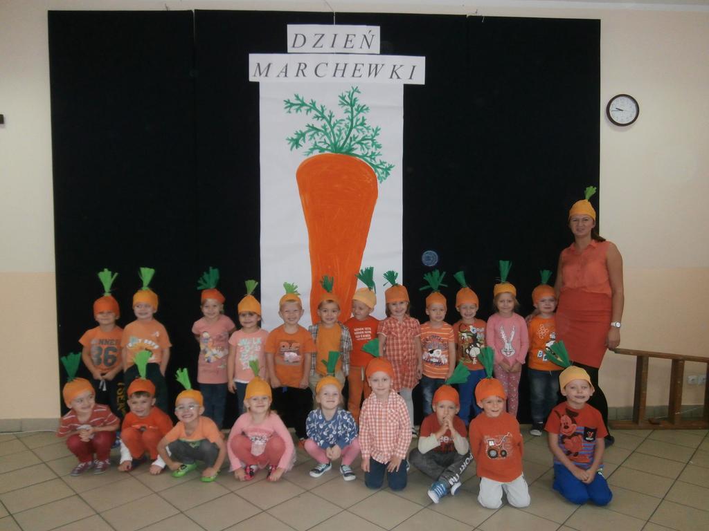 Dnia 13 października 2016 r. w przedszkolu obchodziliśmy Dzień Marchewki. Wszyscy ubrani byliśmy na pomarańczowo. Przez cały tydzień uczyliśmy się o zdrowym odżywianiu. Celem tego dnia było przedstawienie i promowanie spożywania warzyw i owoców jako darów natury na przykładzie marchewki, rozwijanie umiejętności współdziałania w zespole oraz zapoznanie dzieci z rzadko używanym w obecnych czasach sprzętem gospodarstwa domowego - sokowirówką. Wszystkie nasze działania w dniu były związane tematycznie z marchewką. Były zabawy ruchowe ze śpiewem, zagadki i tańce integracyjne przy muzyce. Na koniec wszystkie grupy przedszkolne degustowały przekąski wykonane z marchewki, pyszne ciasto marchewkowe oraz sok. Po takiej dawce witamin, śmiechu i zabawy na pewno wszystkie przedszkolaki będą piękne, zdrowe i uśmiechnięte.
