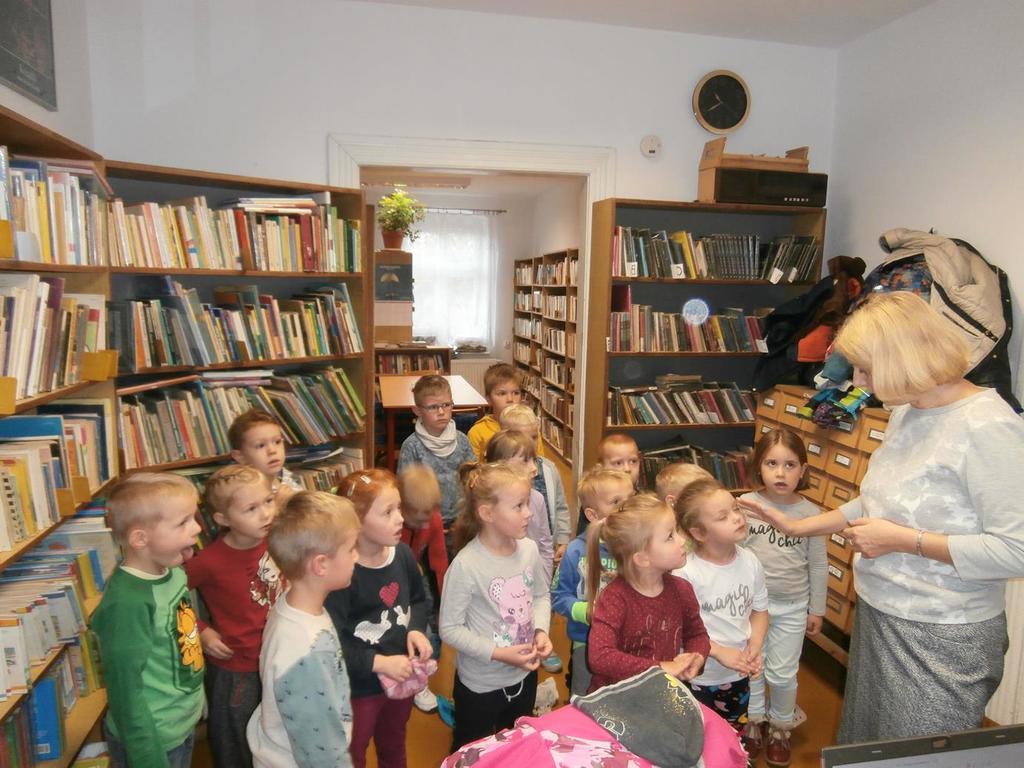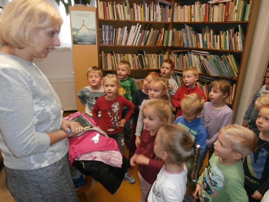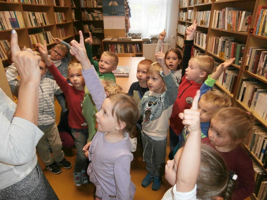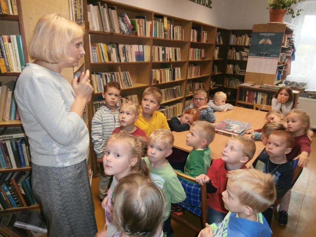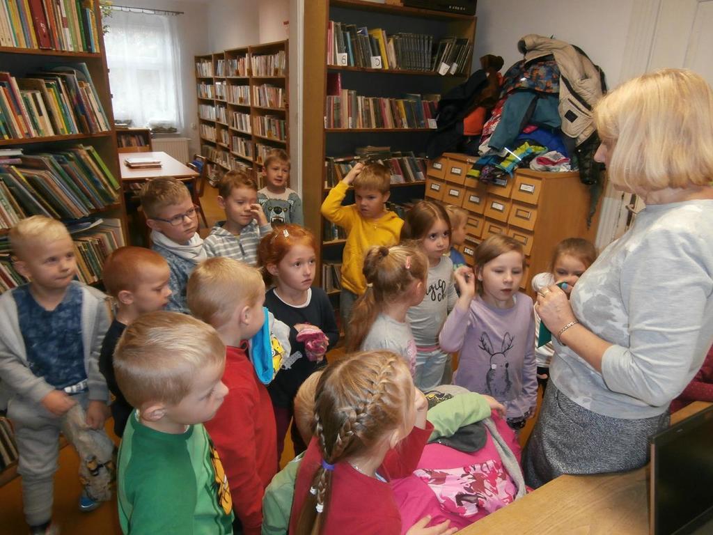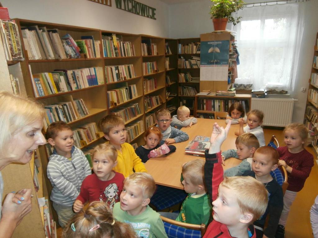 Dnia 18 października 2016 r. grupa 5 latków wybrała się na wycieczkę do biblioteki szkolnej. Pani Wiesława pokazała dzieciom, gdzie znajduje się przeznaczony specjalnie dla nich regał z książkami. Następnie zaprezentowała i dała do obejrzenia dzieciom najmniejsze książeczki z działu dziecięcego. Przedszkolakom bardzo spodobały się kolorowe i bogato ilustrowane książeczki, które z chęcią oglądały. Spotkanie odbywało się w miłej, pełnej uśmiechów i wrażeń atmosferze. Dla wielu przedszkolaków była to pierwsza wizyta w „domu książek”, ale na pewno nie ostatnia.