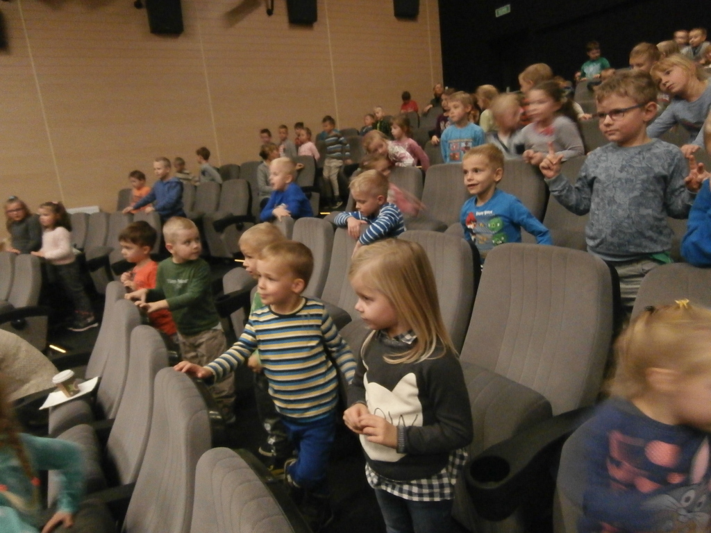 3 listopada grupa 4,5 i 6 latków wybrała się na wycieczkę do kina w Kościerzyny na spektakl Narodowego Teatru Edukacji „Lokomotywa Pana Tuwima”. Aktorzy śpiewem, słowem i ruchem przedstawili historię bohaterów znanych utworów Juliana Tuwima, zabierając nas w podróż krainą wierszy wraz z głównymi bohaterami: Zosią, Grzesiem i rodzicami. Wszystko to w połączeniu z kolorową scenografią, kostiumami i grą świateł dało bajkowy efekt, który zauroczył wszystkie dzieci. Spektakl z pewnością długo zostanie nam w pamięci, a i do wierszy powrócimy jeszcze nie raz.