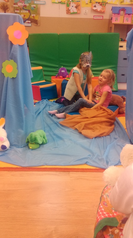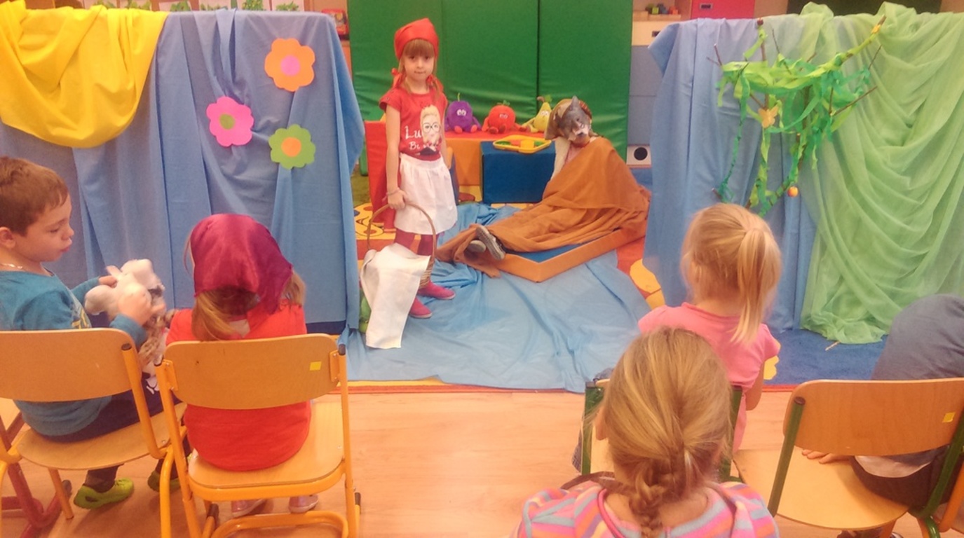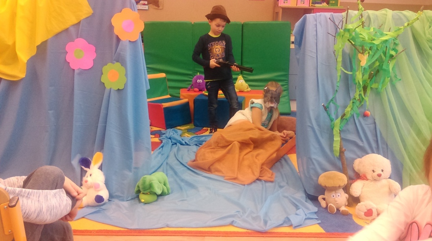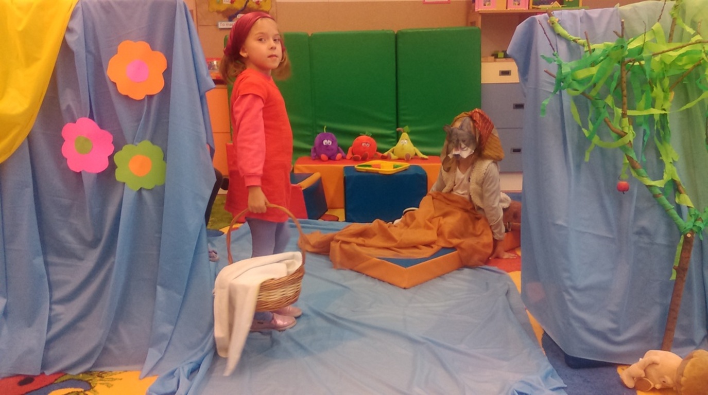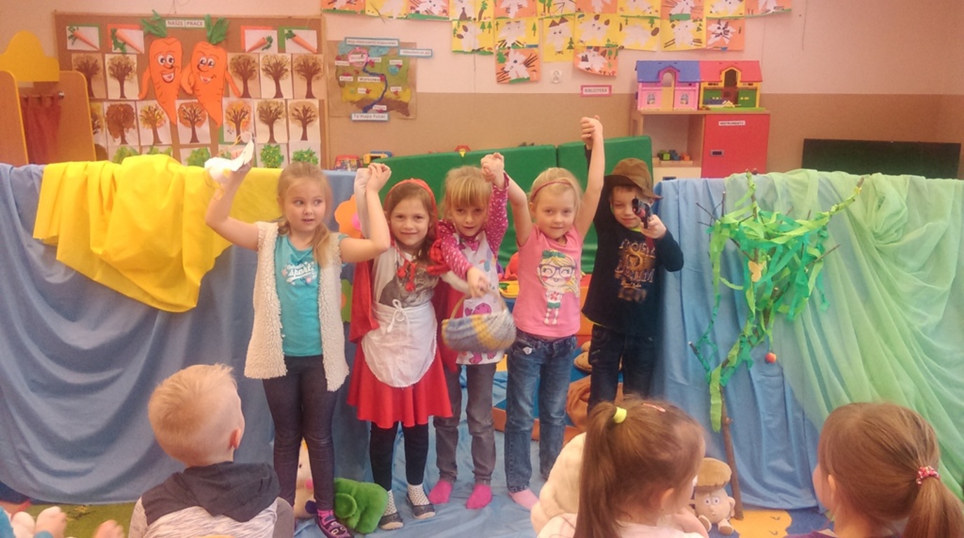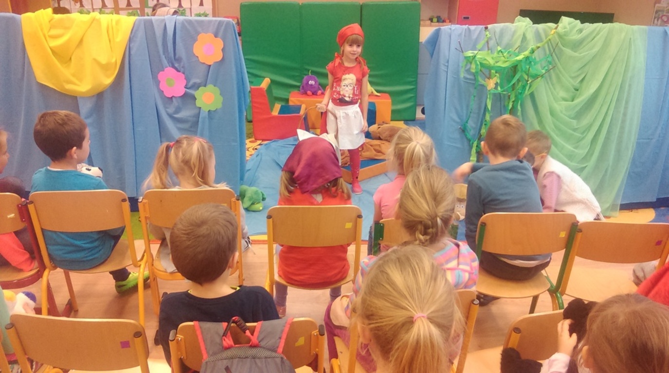 Zabawa w teatr to wspaniała okazja do rozwijania aktywności twórczej dzieci. Przedszkolaki z grupy 6-latków kilka dni temu miały okazję spróbować swoich sił na scenie. Dzieci z pomocą nauczycielki w małych zespołach przygotowywały inscenizację pt. „Czerwony Kapturek”, po czym zaprezentowały ją kolegom i koleżankom z grupy. Gratulujemy małym artystom!