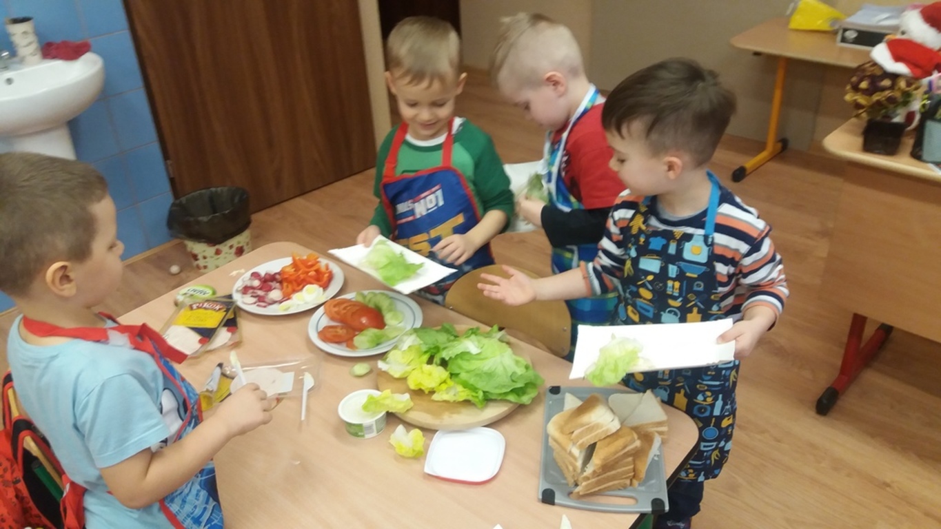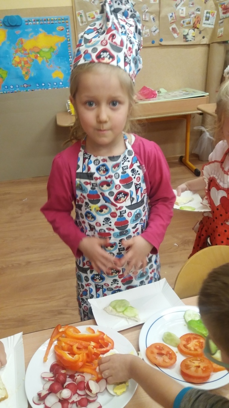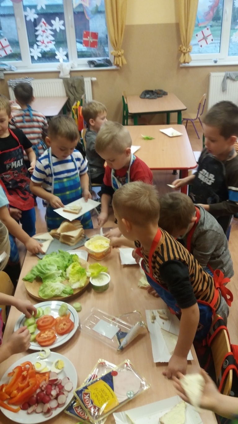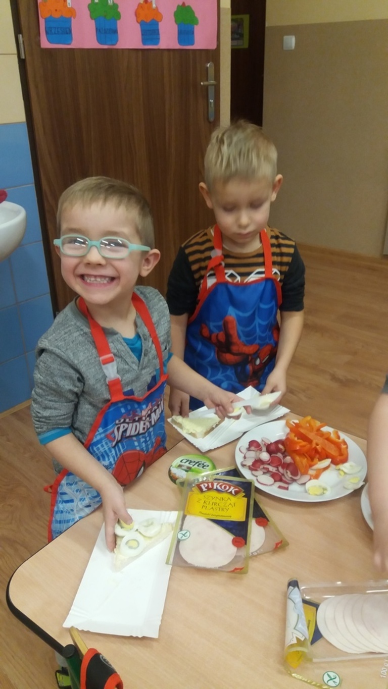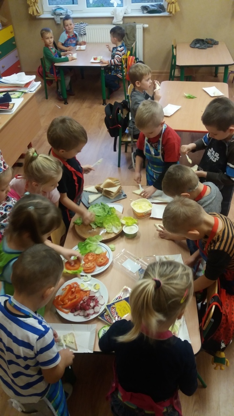 Przedszkolaki podjęły wielkie wyzwanie – same miały przygotować dla siebie drugie śniadanie. Na początku przypomniały sobie zasady bezpieczeństwa, których należy przestrzegać podczas posługiwania się nożem. Po starannym umyciu rączek, założeniu fartuszków i przygotowaniu stanowisk pracy wszyscy zabrali się do pracy. Dzieci samodzielnie smarowały pieczywo masłem, a następnie układały na kromkach wybrane przez siebie produkty. Można śmiało powiedzieć, że zadanie wykonały doskonale. Podczas robienia kanapek kształciły odpowiednie nawyki żywieniowe, rozwijały kreatywność, wyobraźnię oraz dbałość o higienę.