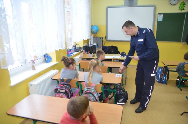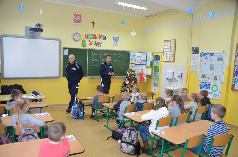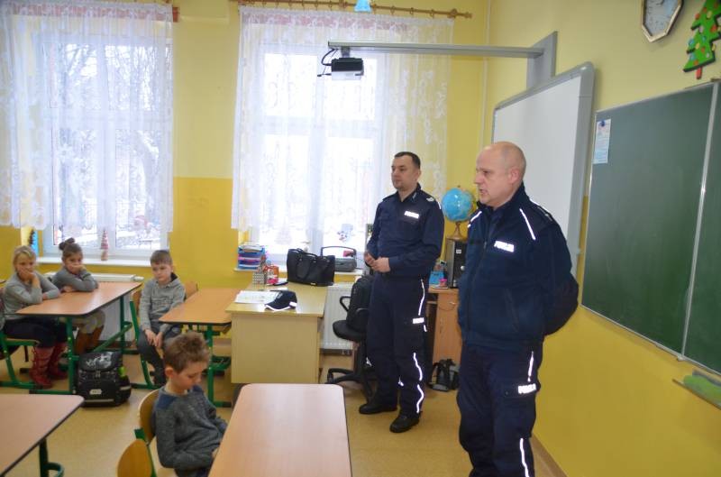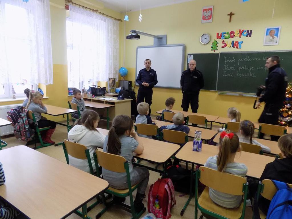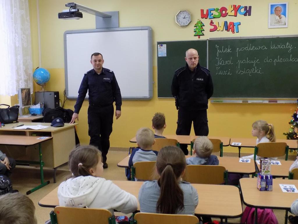 W czasie spotkania funkcjonariusze poruszali temat bezpiecznych zachowań w czasie ferii zimowych. Przypominali zasady prawidłowego poruszania się po drodze, konieczności noszenia odblasków. Poruszali również temat o ostrożnym zachowaniu wobec osób obcych.