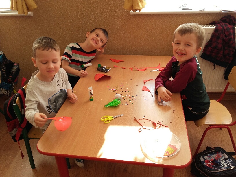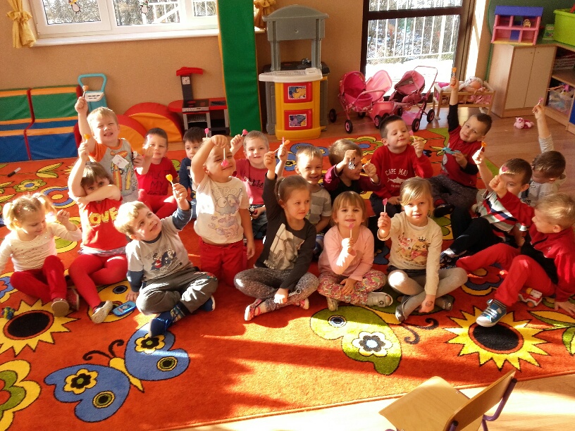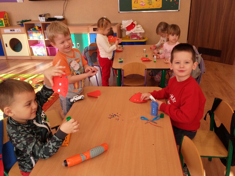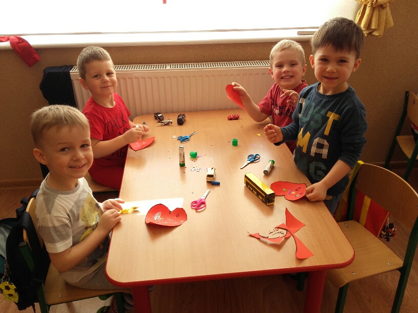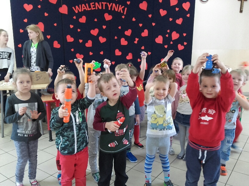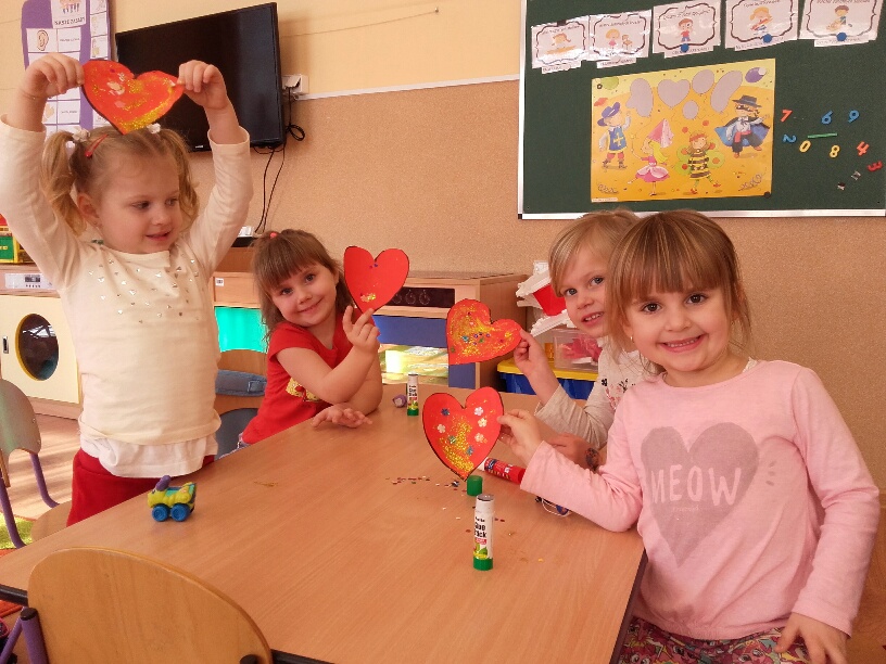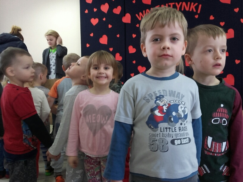 Wielką atrakcją dla przedszkolaków był kiermasz walentynkowy, gdzie dzieci za zakupione losy otrzymały zabawki. Każdy przedszkolak przygotował również walentynkę dla swoich najbliższych by okazać jak bardzo ich kocha. Był też słodki poczęstunek w formie lizaków - serduszek, oraz pączków zrobionych przez mamę Nataniela Gałazin, za co serdecznie dziękujemy. Pani również otrzymała od dzieci słodki upominek i walentynkę co wywołało radość i wzruszenie.