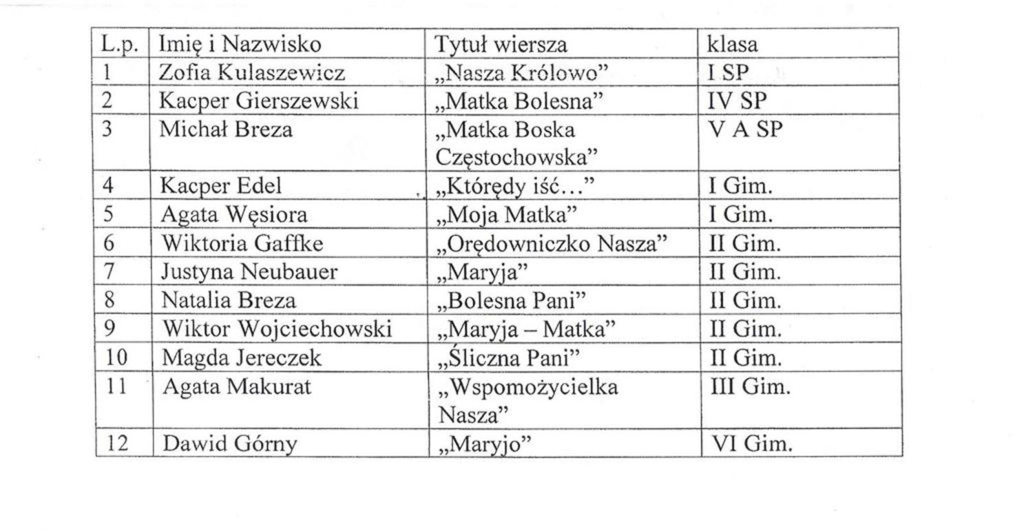 16 marca 2017 r. rozstrzygnięto Szkolny Konkurs Poezji Maryjnej dla autorów wierszy. Brało w nim udział 12 uczniów naszej szkoły. Najlepszymi okazali się: Zofia Kulaszewicz z wierszem "Nasza Królowo", Wiktor Wojciechowski z kl. II Gimnazjum z wierszem "Maryja-Matka", Michał Breza z kl. Va z wierszem "Matka Boska Częstochowska". oraz Agata Węsiora z kl. I Gimnazjum z wierszem "Moja Matka".