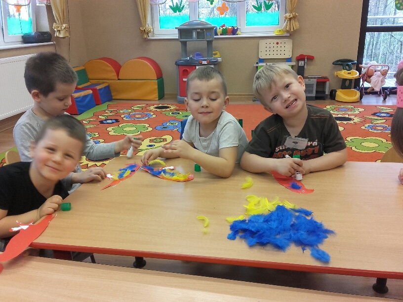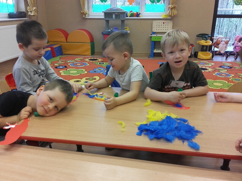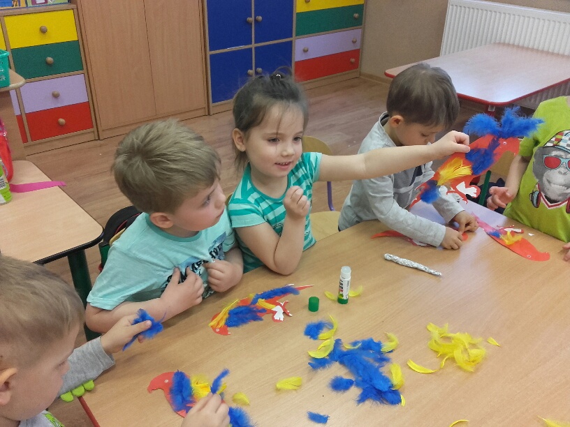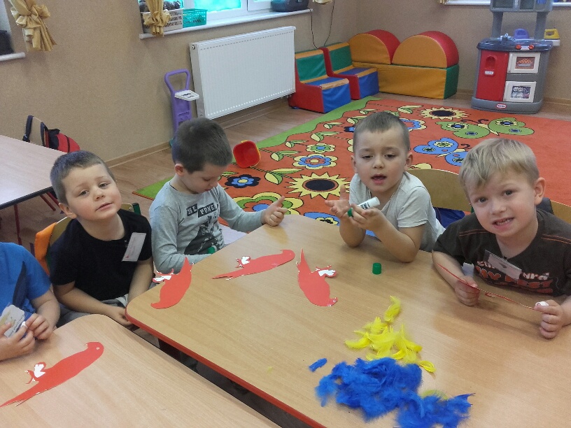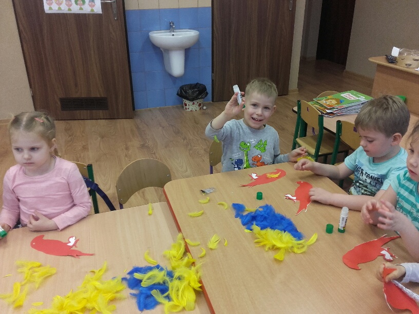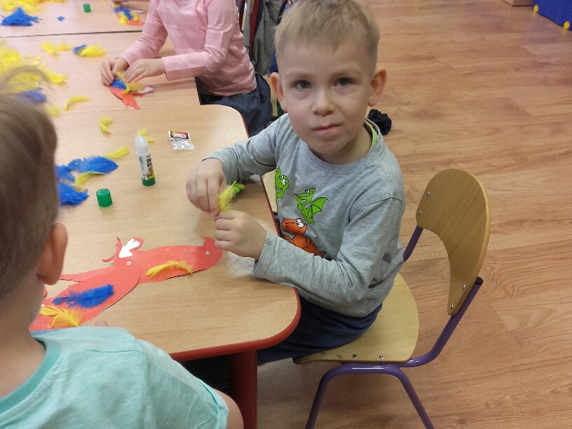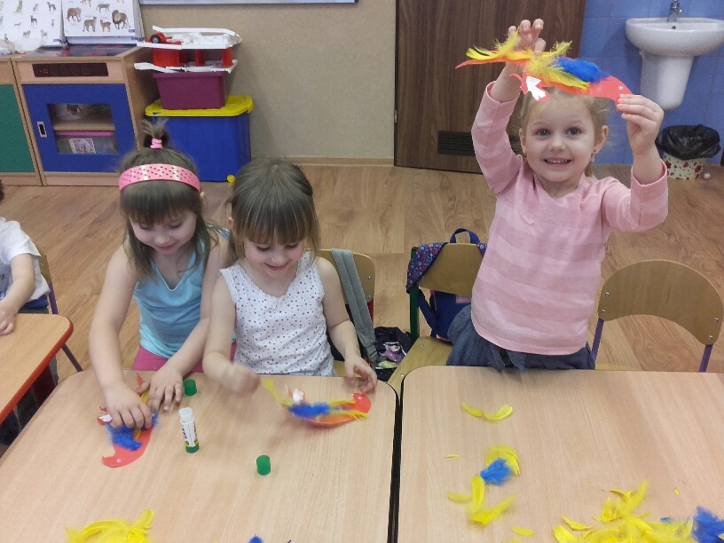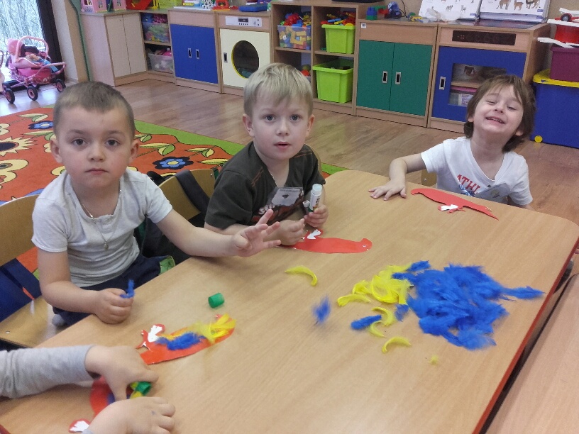 W ramach zajęć plastycznych grupa 4-latków rozwijała swoje umiejętności ozdabianiem i uzupełnianiem obrazka papugi. Dzieci z radością zabrały się do pracy i z zapałem ozdabiały papugi. Najpierw naklejały oczka a następnie przyklejały kolorowe piórka. Przedszkolaki wykazały się dużą inwencją twórczą w efekcie czego powstały piękne prace, które ozdobiły naszą gazetkę.