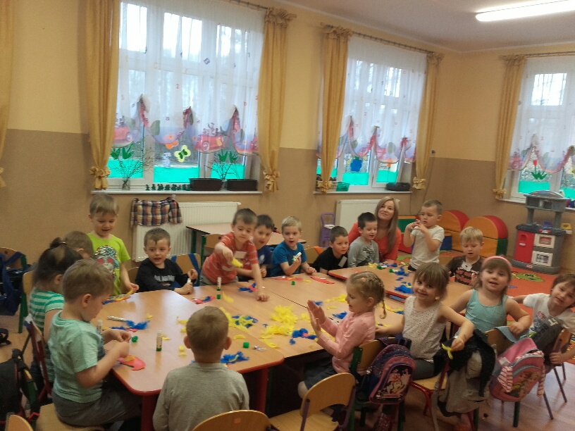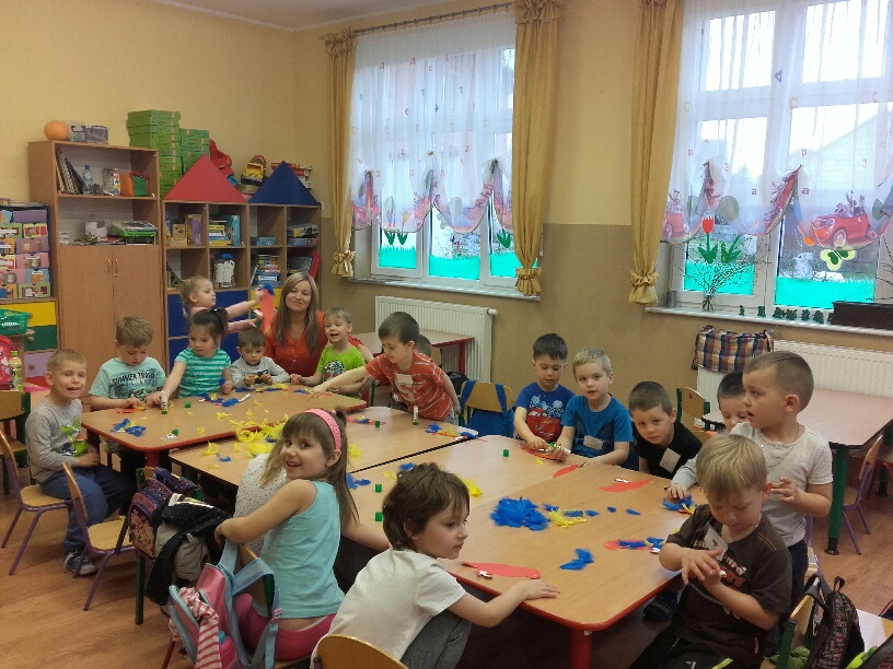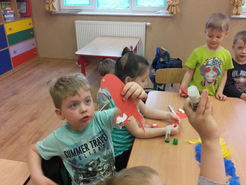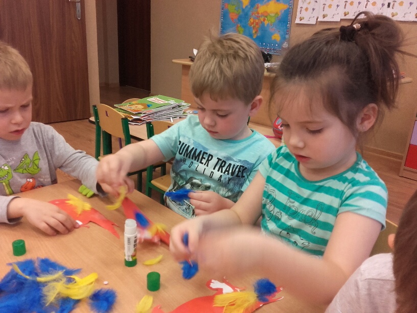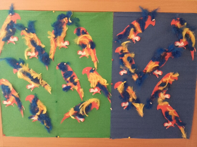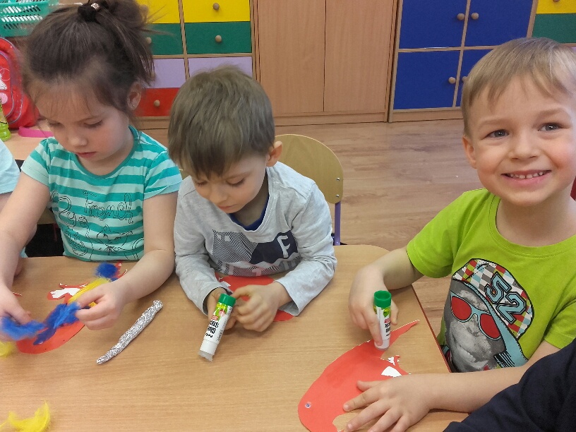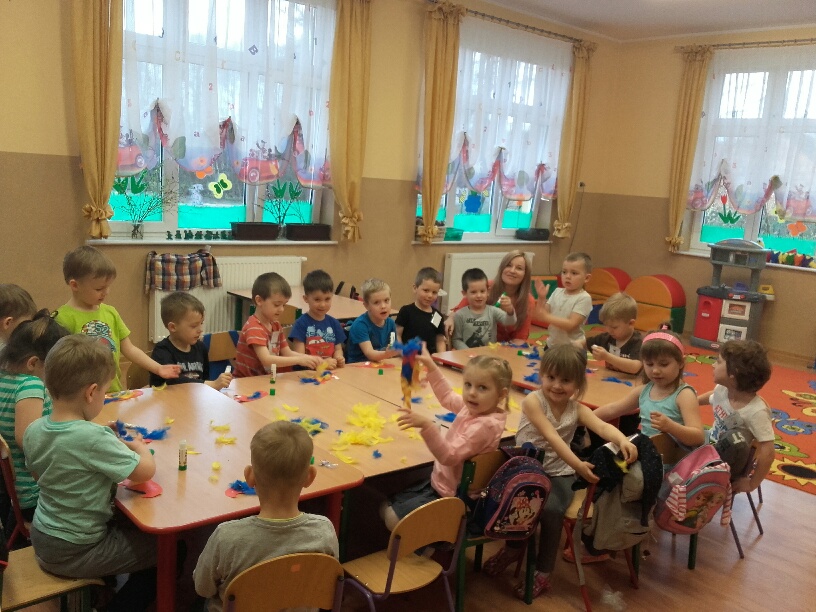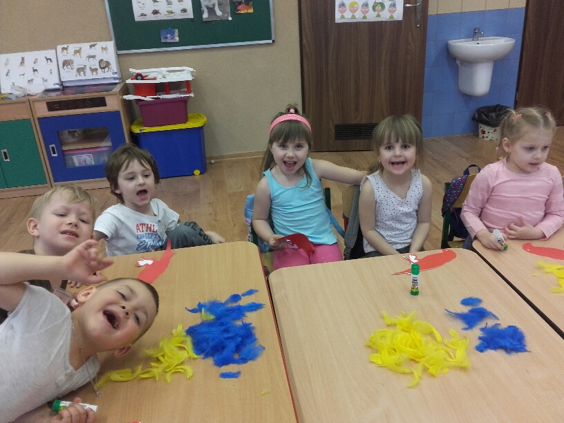 W ramach zajęć plastycznych grupa 4-latków rozwijała swoje umiejętności ozdabianiem i uzupełnianiem obrazka papugi. Dzieci z radością zabrały się do pracy i z zapałem ozdabiały papugi. Najpierw naklejały oczka a następnie przyklejały kolorowe piórka. Przedszkolaki wykazały się dużą inwencją twórczą w efekcie czego powstały piękne prace, które ozdobiły naszą gazetkę.