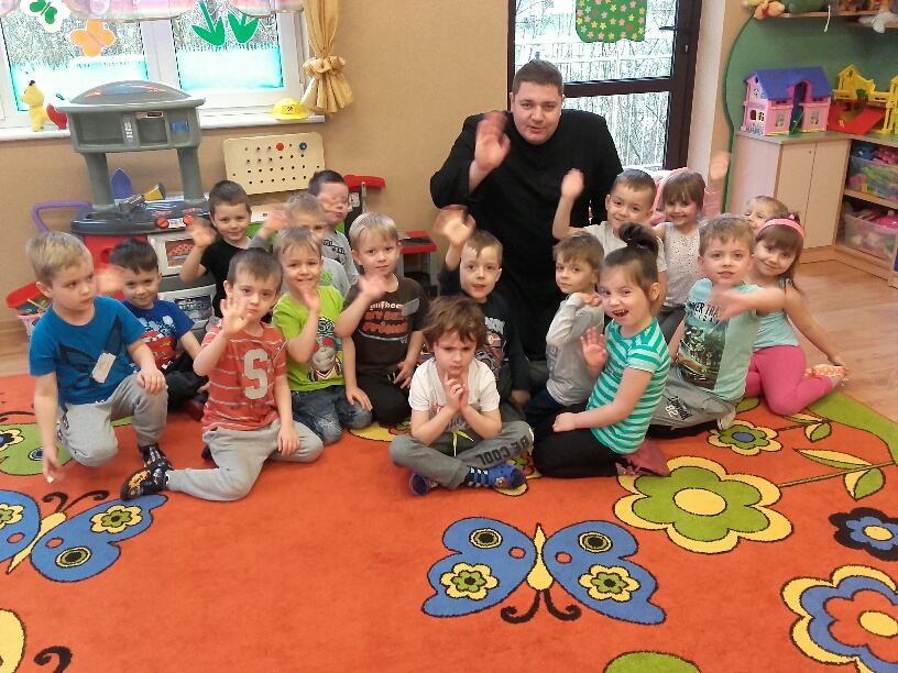 W środę 5 kwietnia grupę 4 - latków odwiedził kleryk Patryk Świst, przywitał się z każdym przedszkolakiem oraz nauczył dzieci refrenu piosenki: "Święty uśmiechnięty." Dzieci śpiewały wspólnie z księdzem wraz z zilustrowanymi ruchami. Bardzo dziękujemy duszpasterzowi za wizytę i za wspólną zabawę przy piosence.
