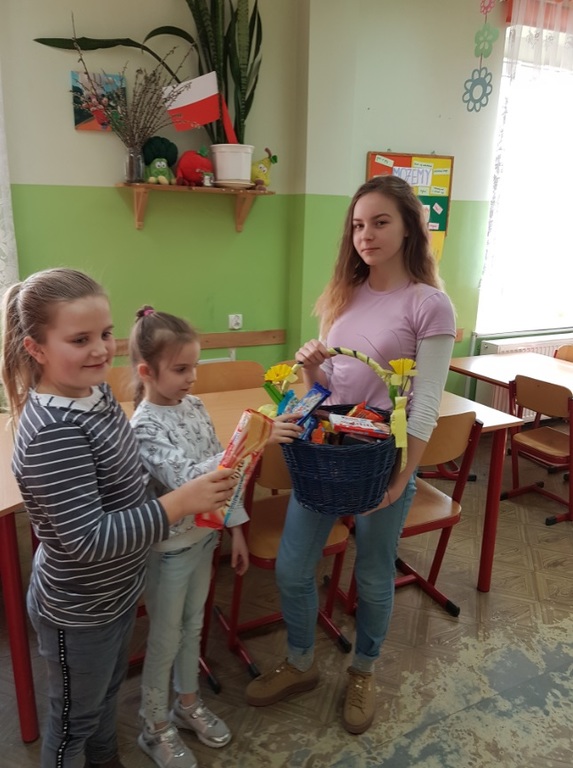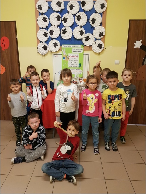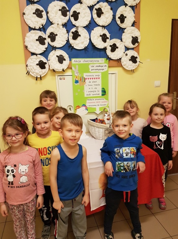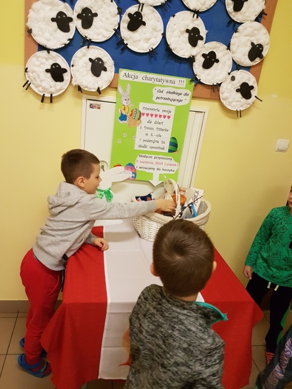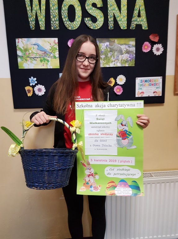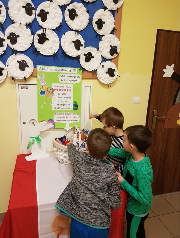 W piątek 5 kwietnia 2019 r w naszej w szkole i przedszkolu odbyła się świąteczna zbiórka słodyczy dla podopiecznych Domu Dziecka Organizatorami akcji był samorząd szkolny a opiekunami A . Ferdynus i M . Kulaszewicz .