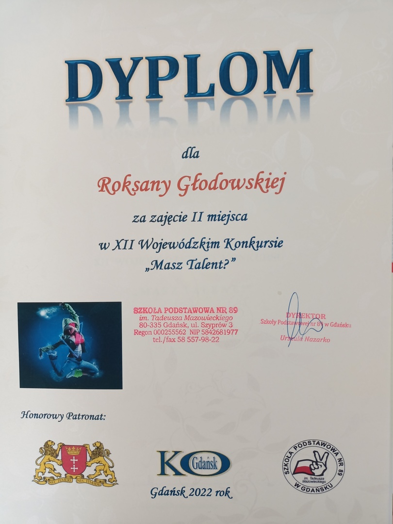 Uczennica klasy V - Roksana Głodowska - wywalczyła drugie miejsce w finałowym, wojewódzkim etapie konkursu "Masz talent?", który odbył się 7 maja b.r. w Szkole Podstawowej nr 89 im. Tadeusza Mazowieckiego w Gdańsku. Warto wspomnieć, że naszą szkołę reprezentowała też Olga Tomaczkowska, której występ również został zakwalifikowany (spośród 80 uczestników) do finałowego etapu konkursu. Serdecznie gratulujemy sukcesu!