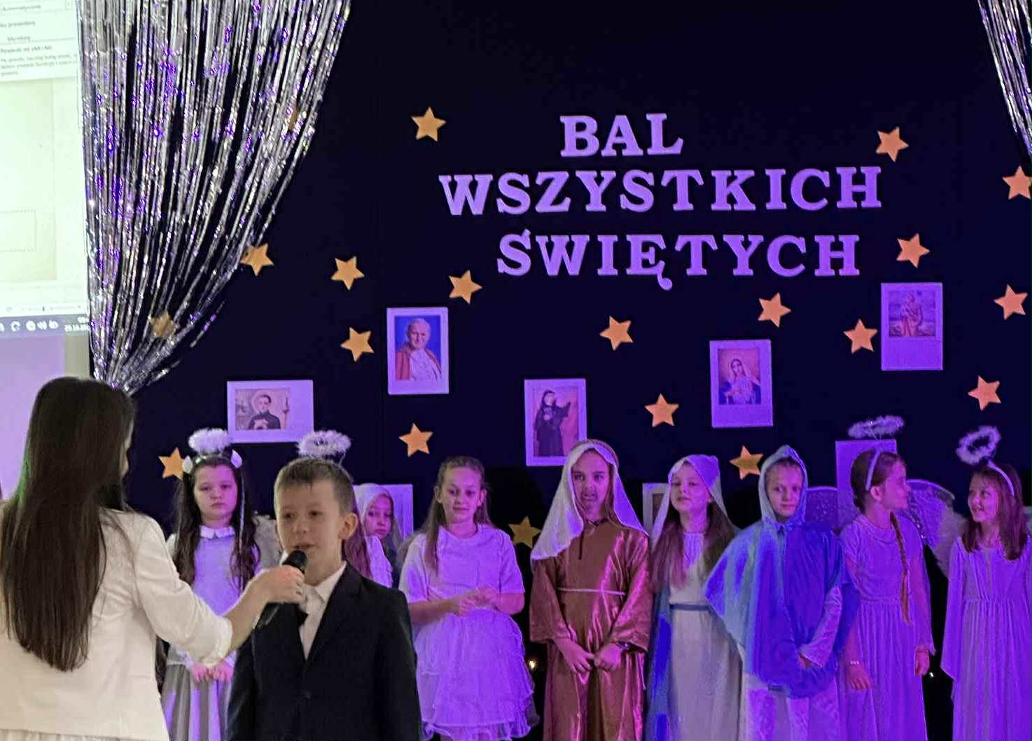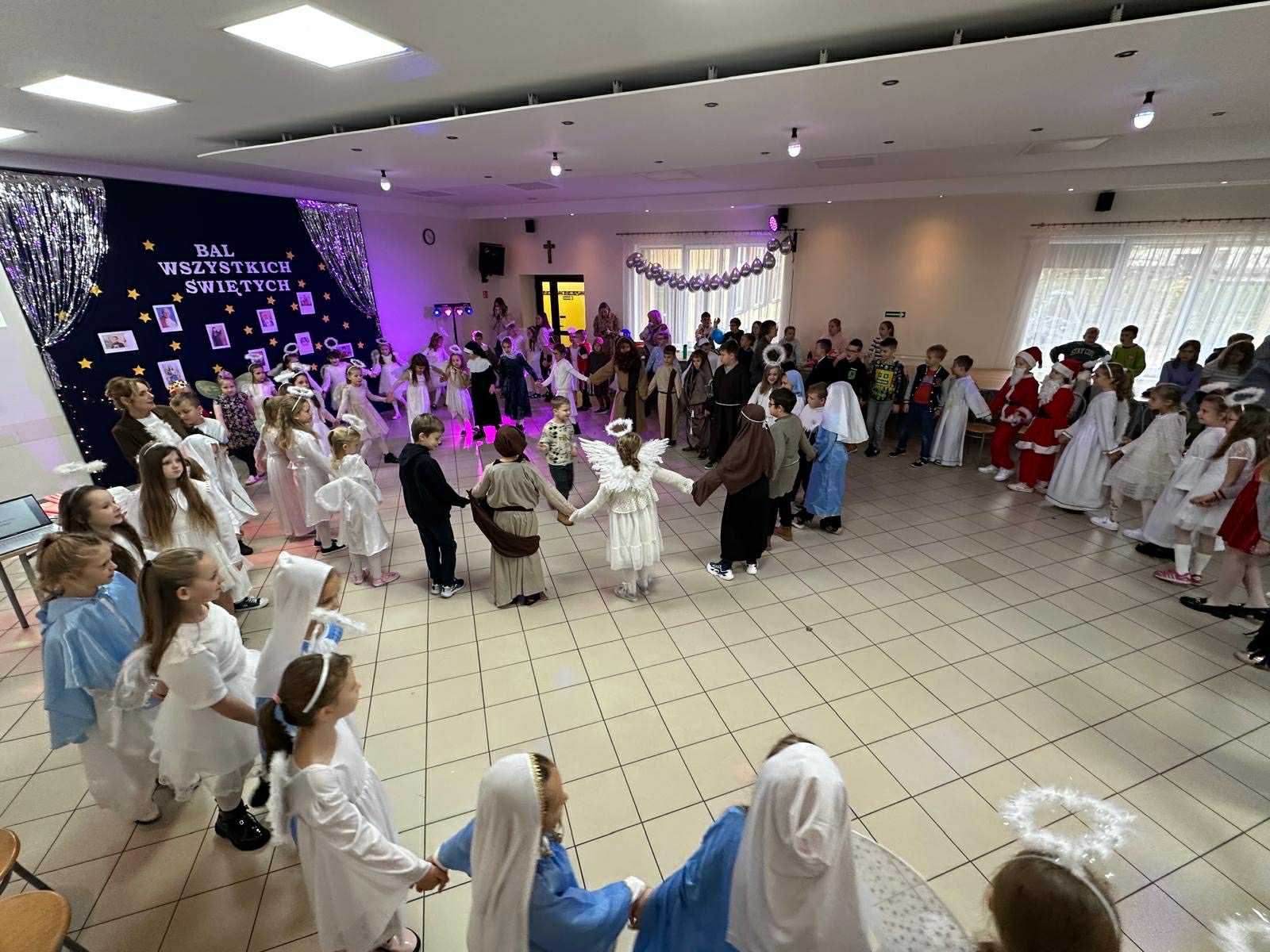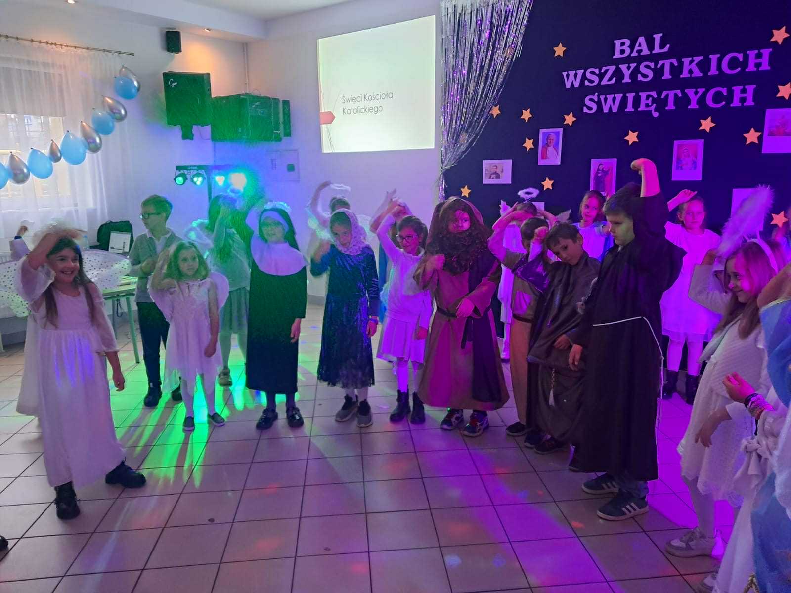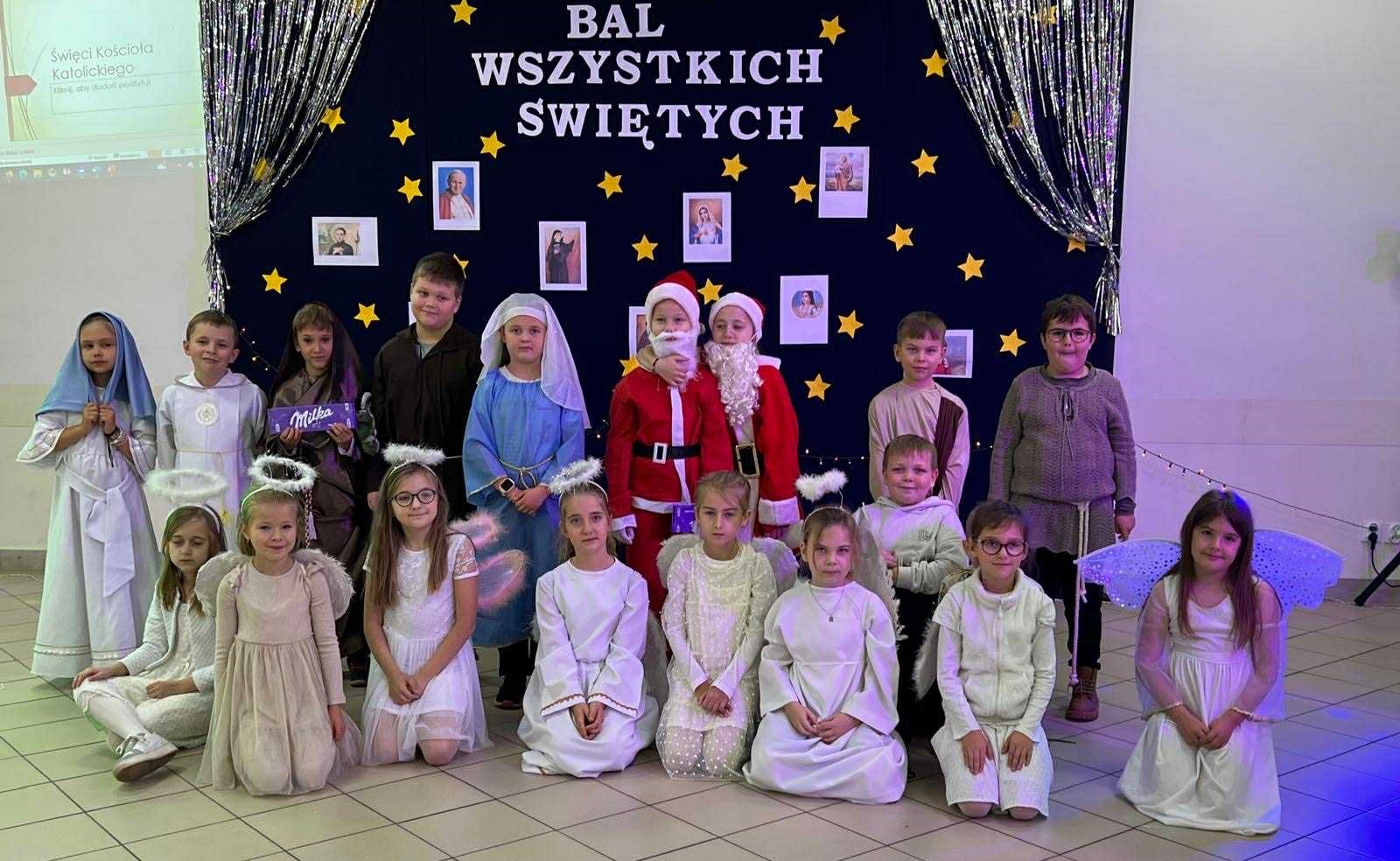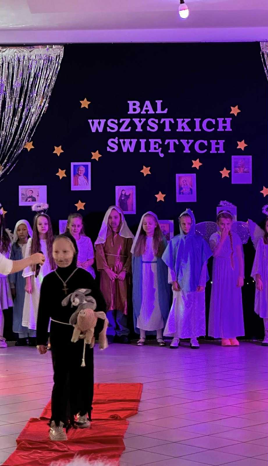 Uczniowie z klas 1-3 przyszli przebrani za świętych i aniołów, tworząc niezwykły, kolorowy korowód pełen uśmiechów i pozytywnej energii. Podczas balu odbyły się konkursy z nagrodami, wspólne tańce, śpiew piosenek religijnych, a także zabawy integracyjne, które dostarczyły wszystkim uczestnikom wiele radości.