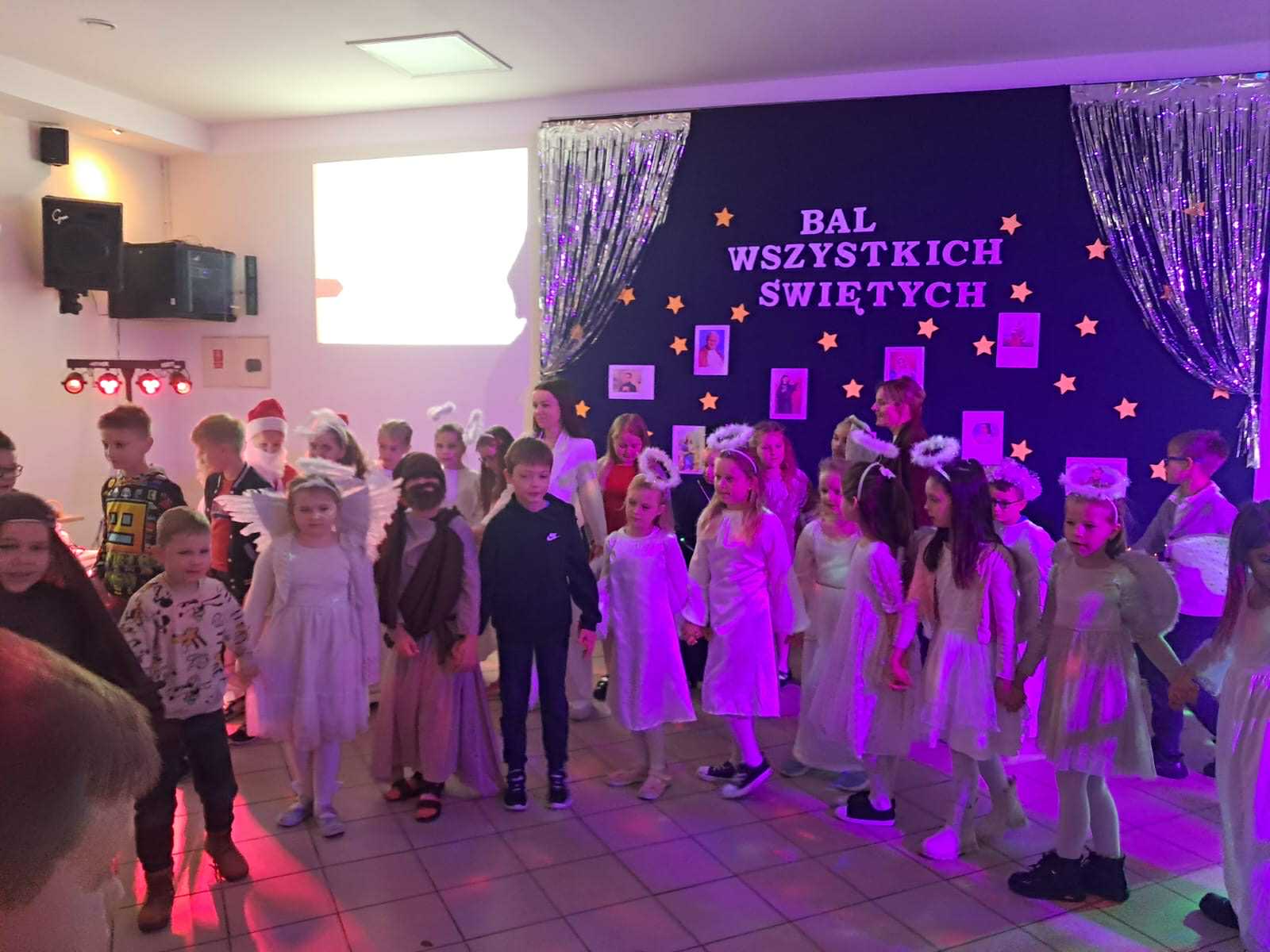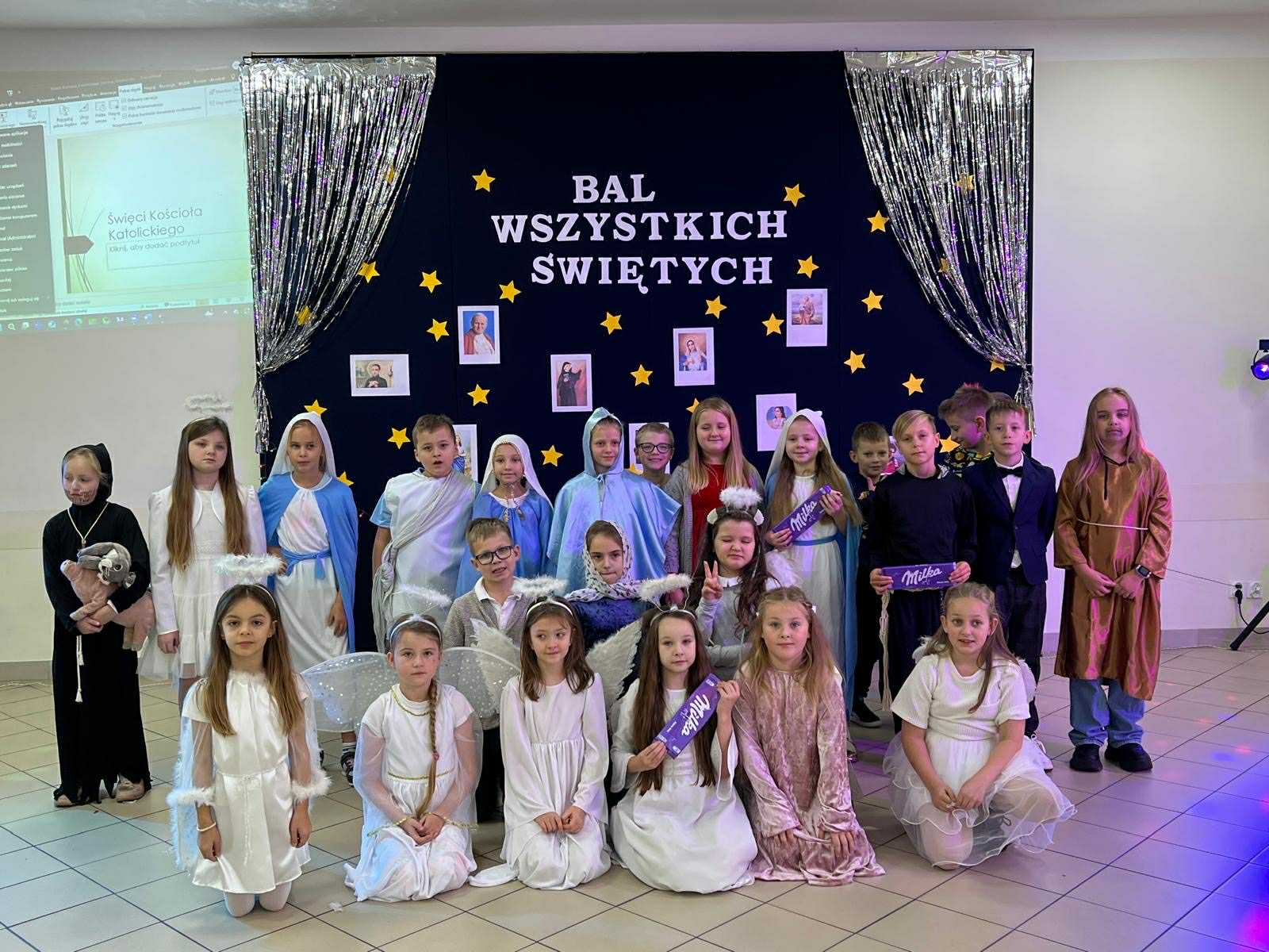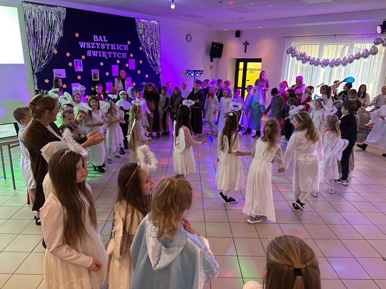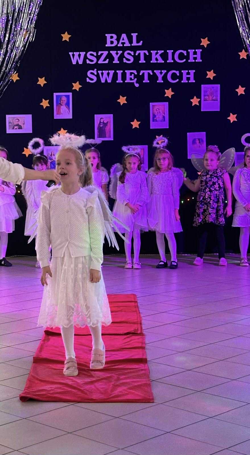 Uczniowie z klas 1-3 przyszli przebrani za świętych i aniołów, tworząc niezwykły, kolorowy korowód pełen uśmiechów i pozytywnej energii. Podczas balu odbyły się konkursy z nagrodami, wspólne tańce, śpiew piosenek religijnych, a także zabawy integracyjne, które dostarczyły wszystkim uczestnikom wiele radości.
