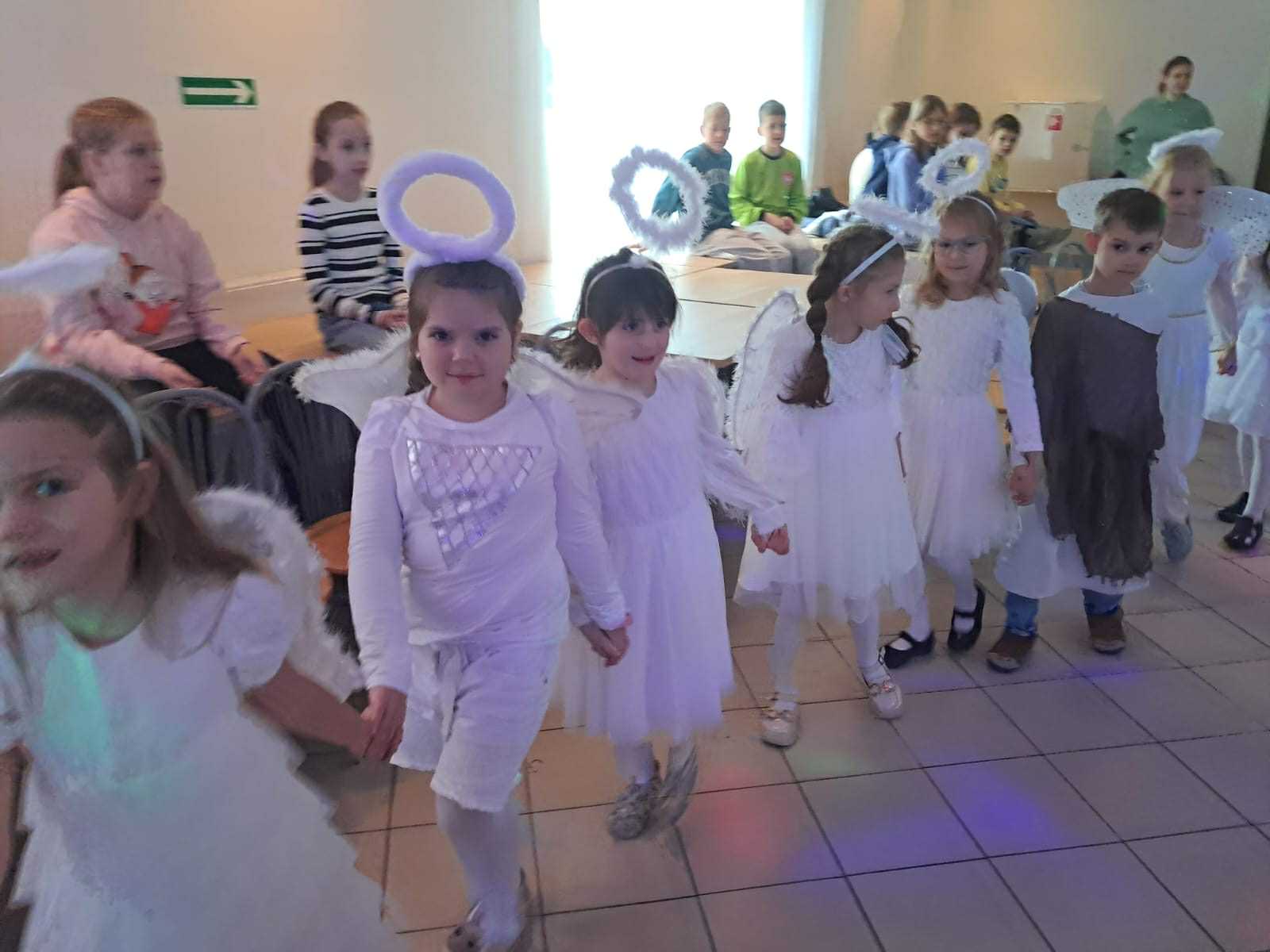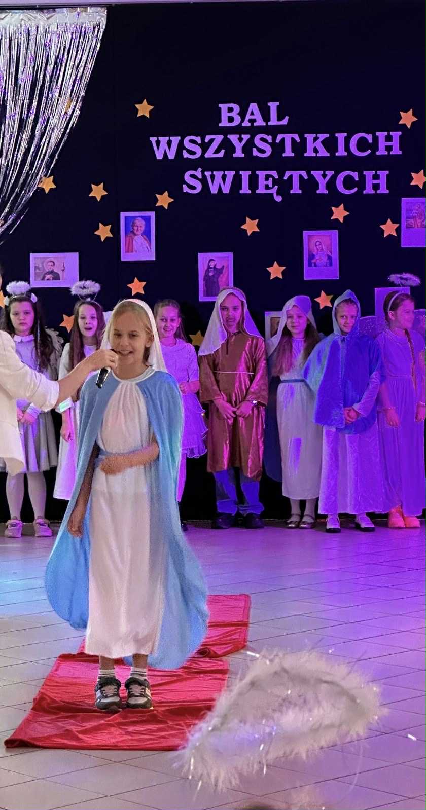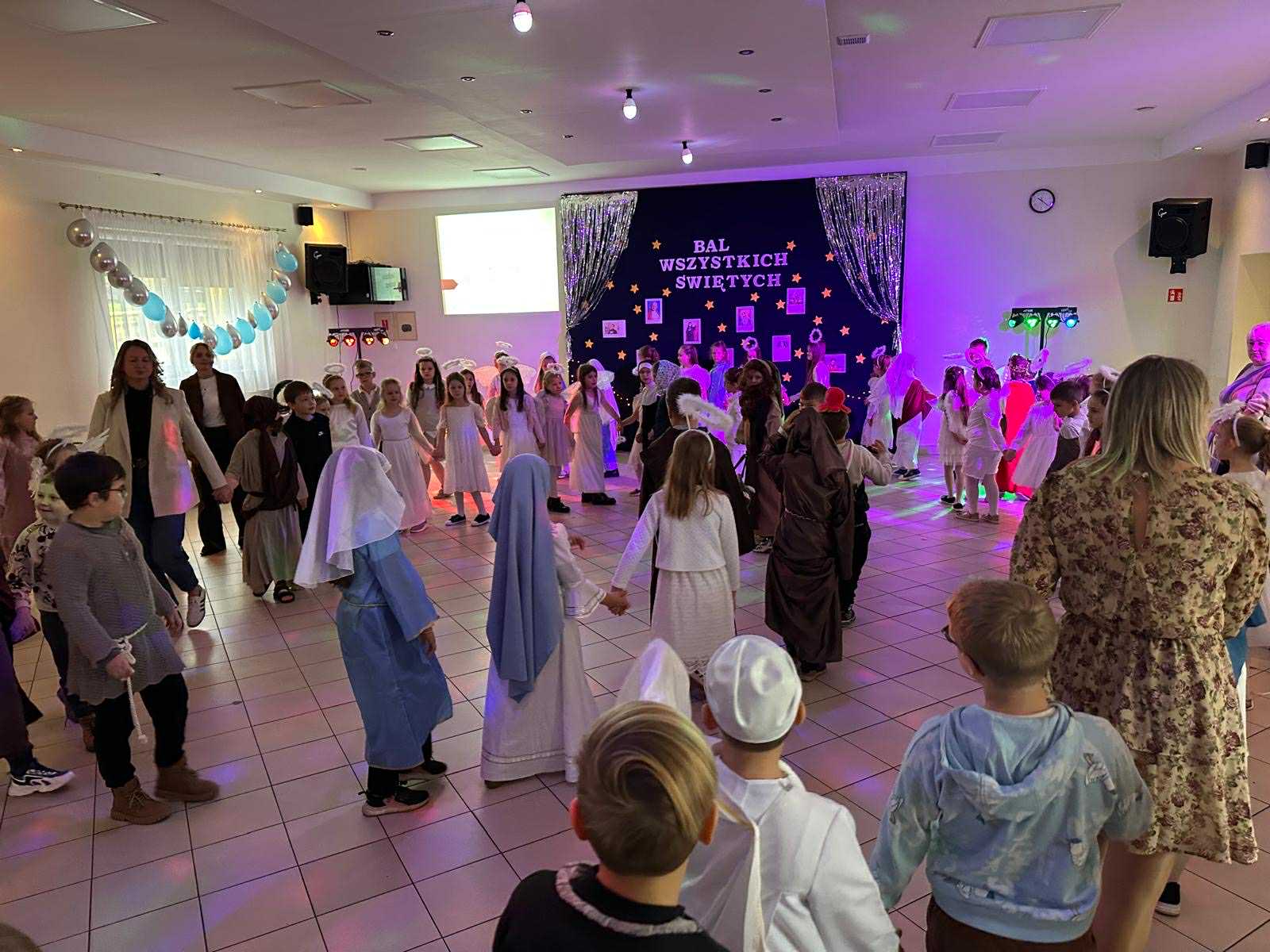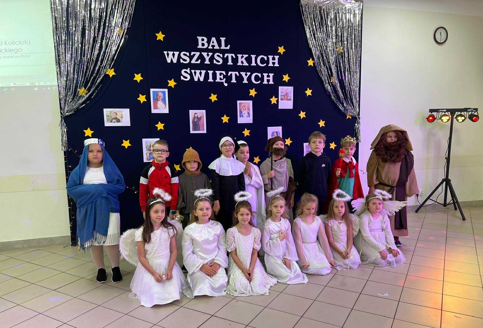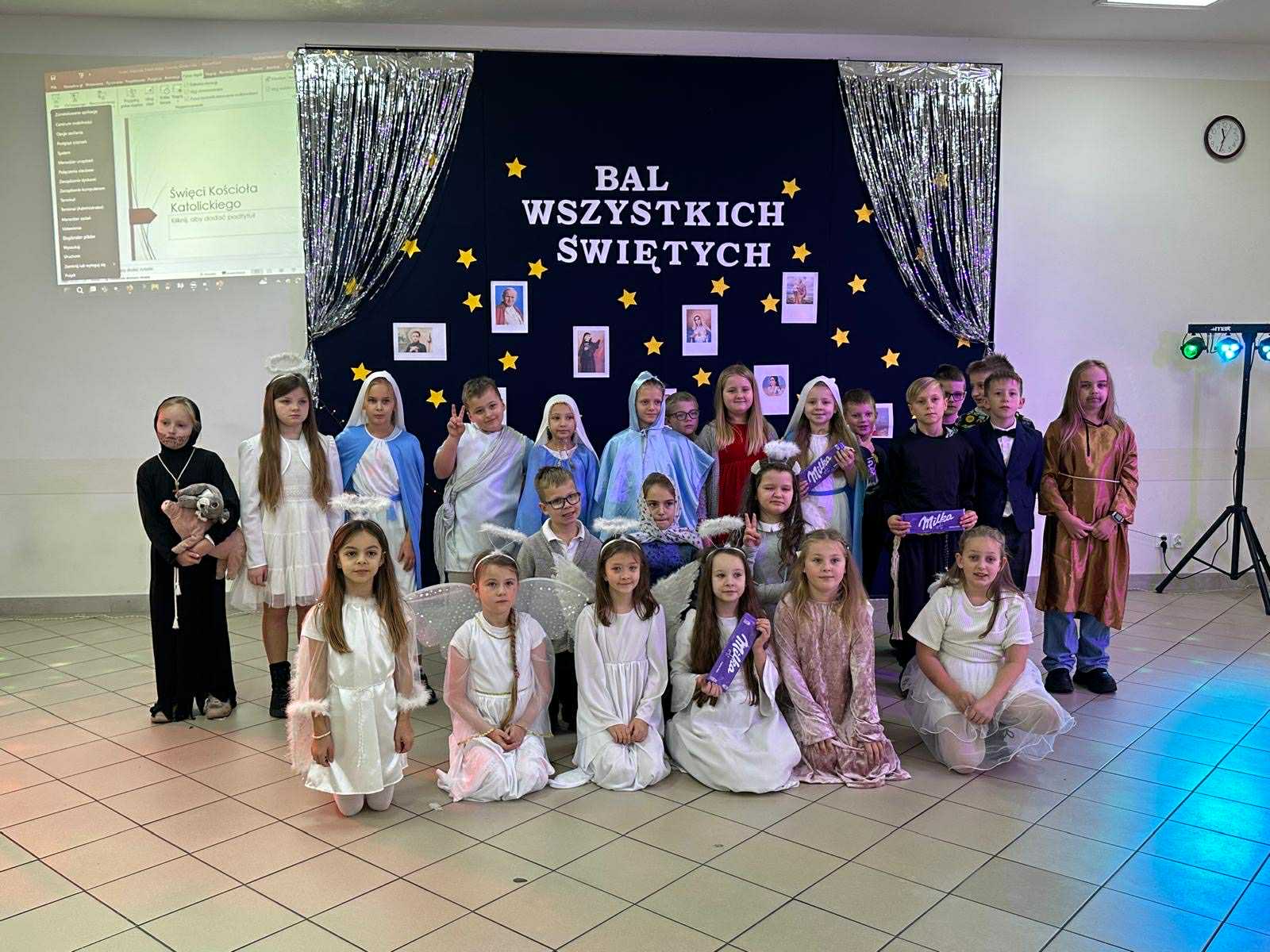 Uczniowie z klas 1-3 przyszli przebrani za świętych i aniołów, tworząc niezwykły, kolorowy korowód pełen uśmiechów i pozytywnej energii. Podczas balu odbyły się konkursy z nagrodami, wspólne tańce, śpiew piosenek religijnych, a także zabawy integracyjne, które dostarczyły wszystkim uczestnikom wiele radości.