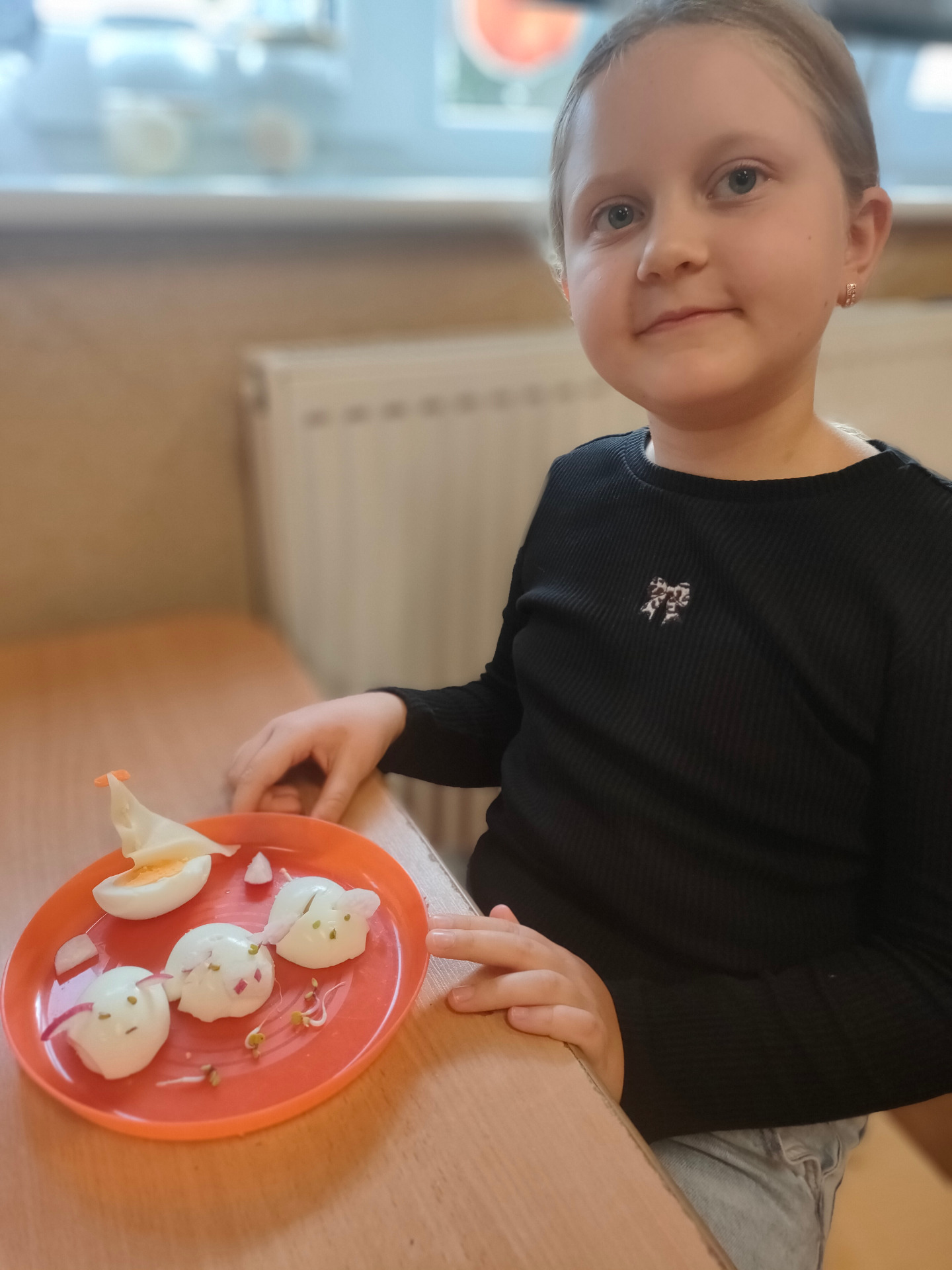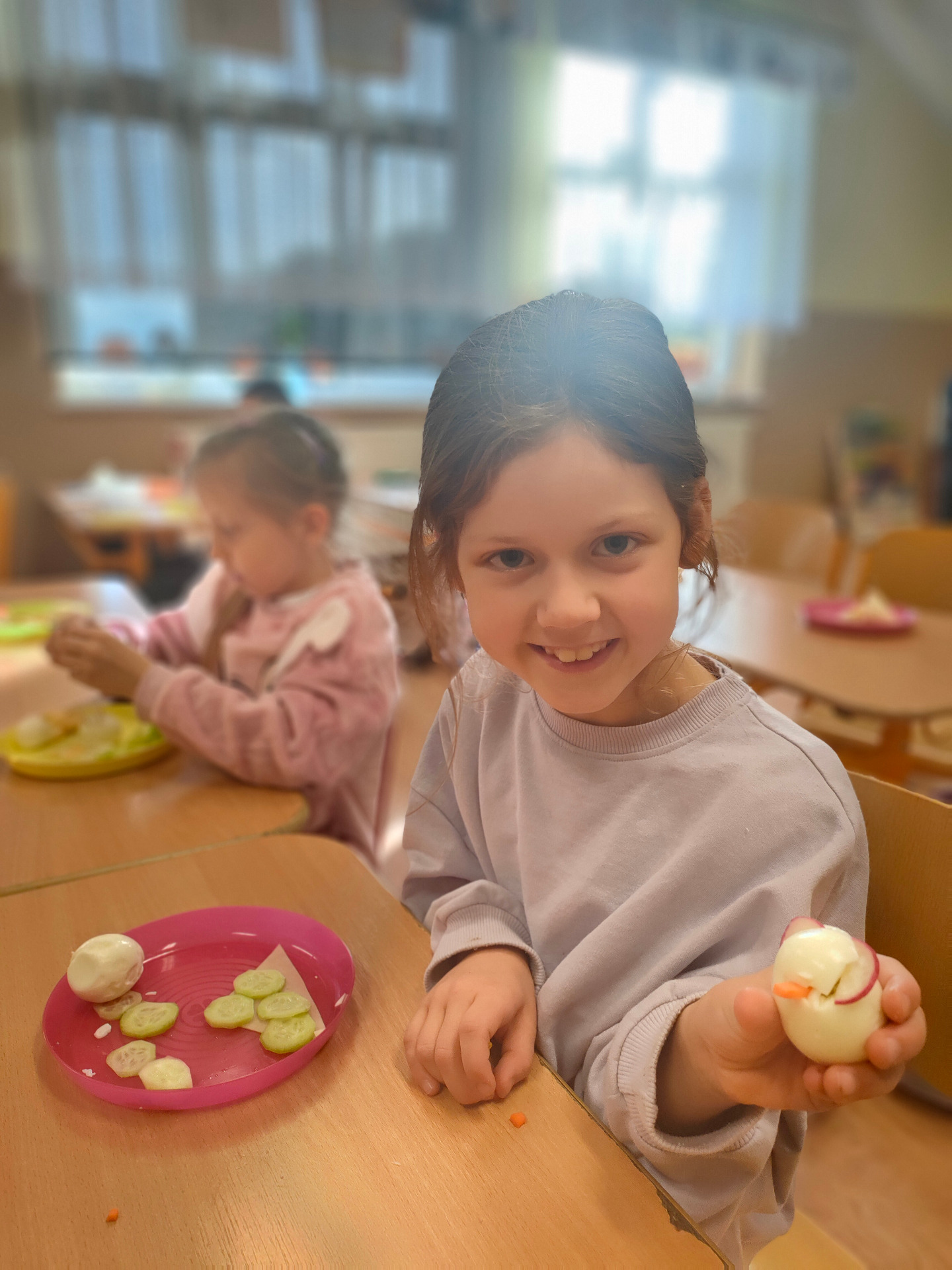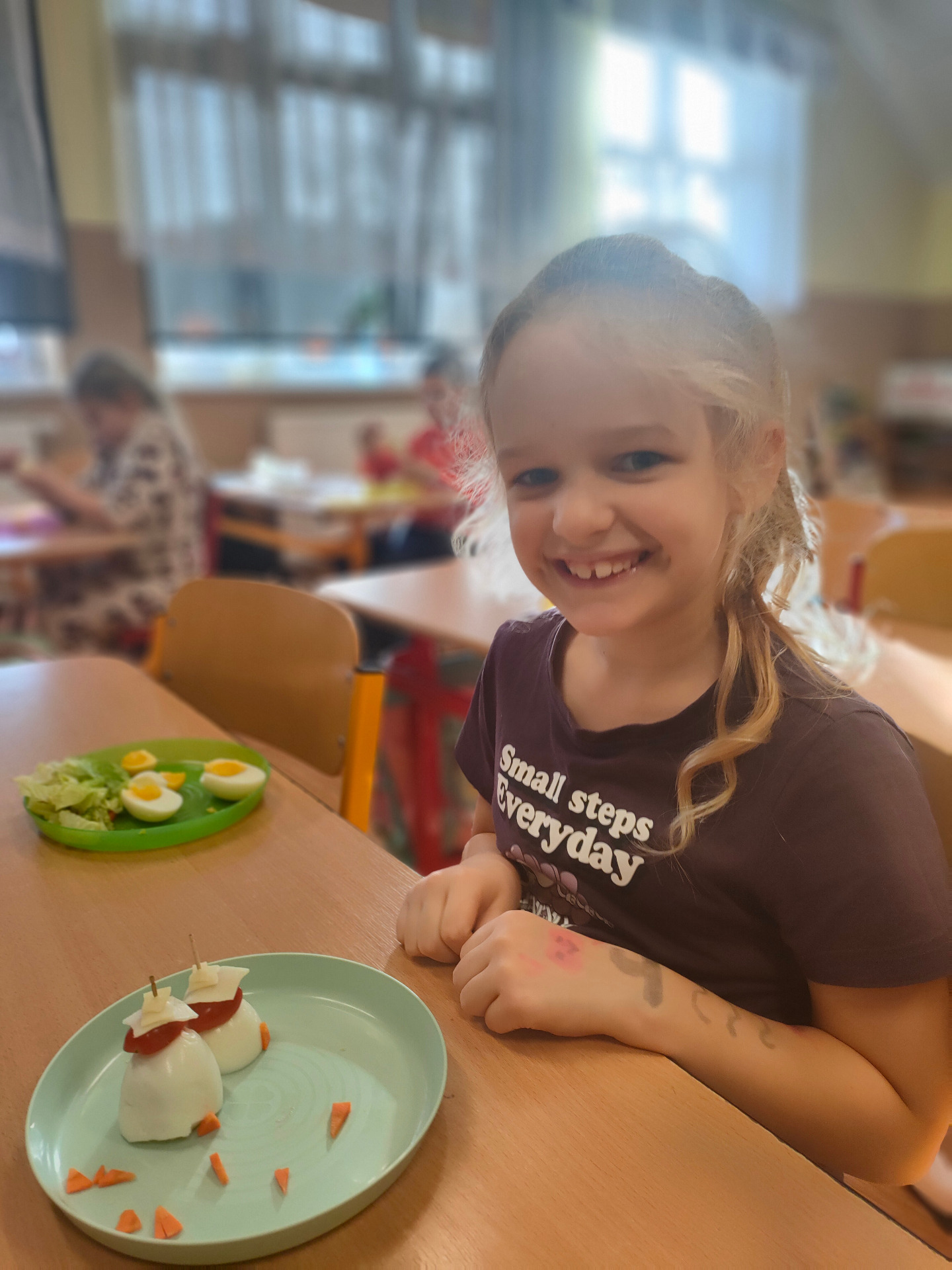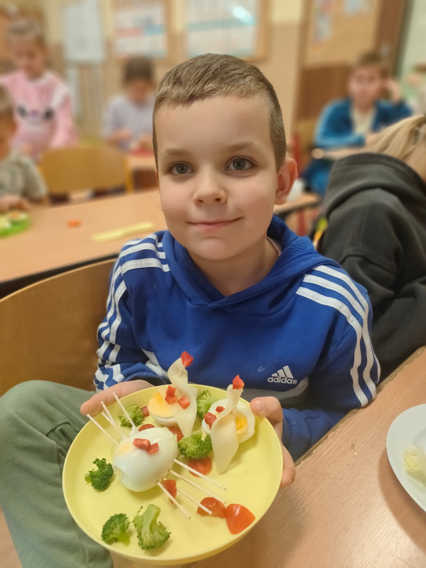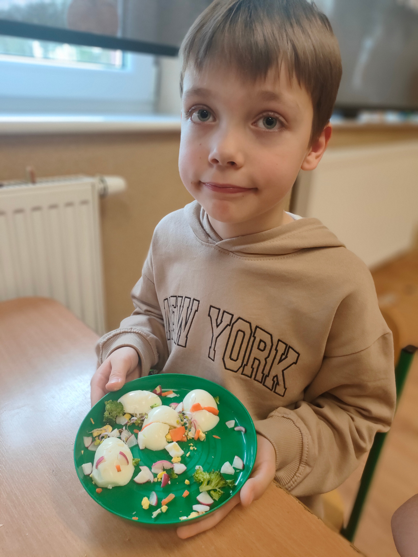 Uczniowie klasy 1 przygotowywali zdrowe i smaczne posiłki z wykorzystaniem jajek. Podczas zajęć dzieci dowiedziały się, dlaczego jajko jest tak cennym składnikiem naszej diety – zawiera bowiem wiele witamin, białko oraz składniki mineralne niezbędne do prawidłowego rozwoju. Po części teoretycznej przyszedł czas na twórcze działanie! Uczniowie przygotowali kolorowe przekąski z jajek, ozdabiając je warzywami. Z marchewek, pomidorów, ogórków, szczypiorku itp. powstały prawdziwe małe dzieła sztuki – zwierzątka, postacie i fantazyjne kompozycje.