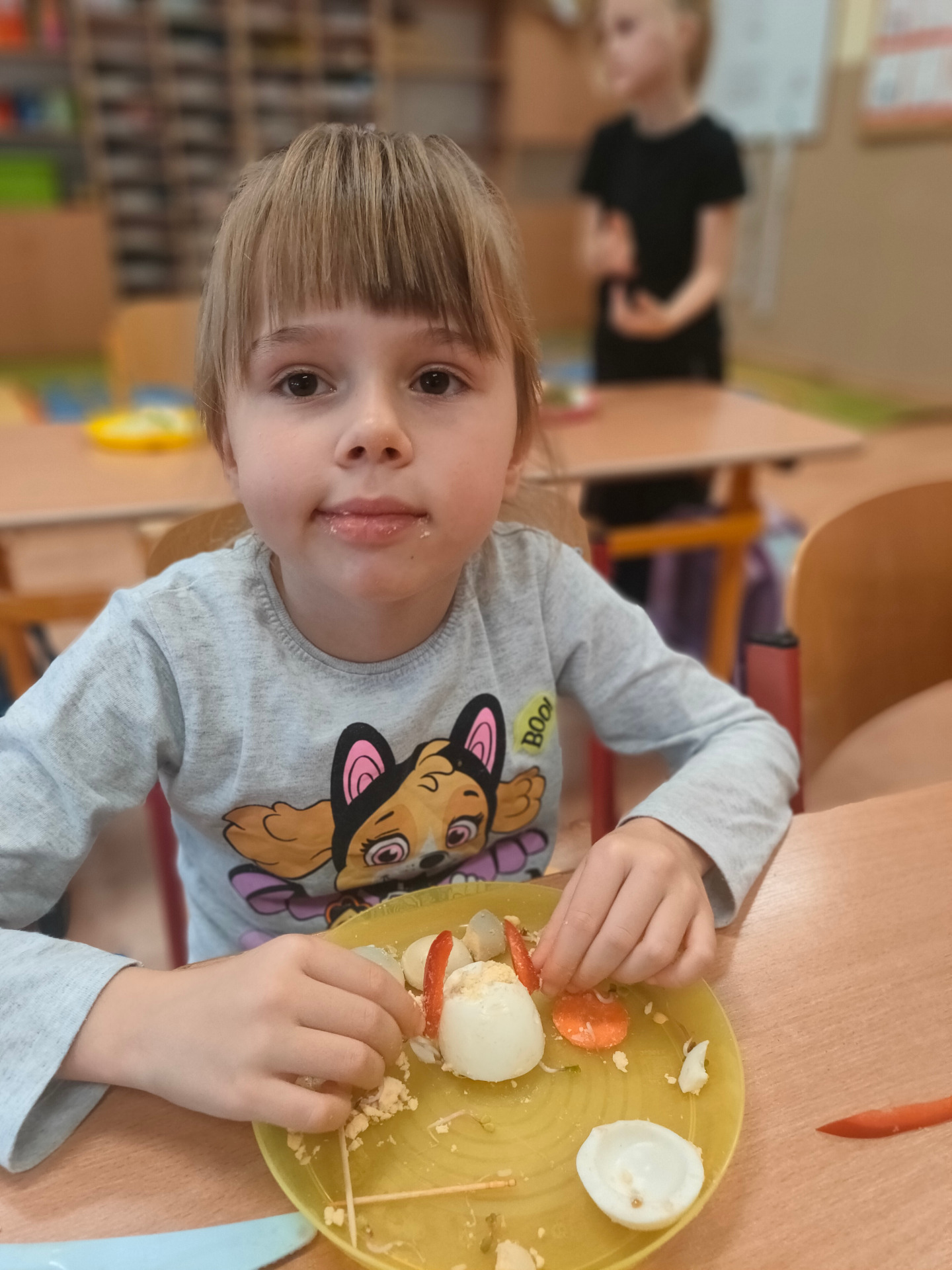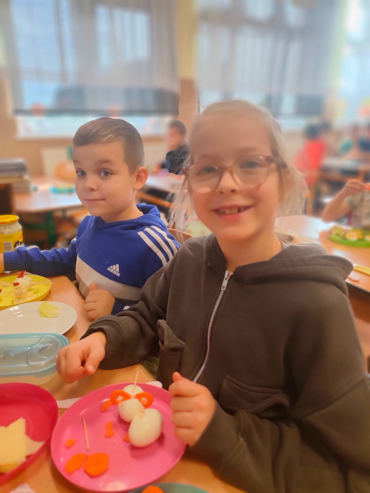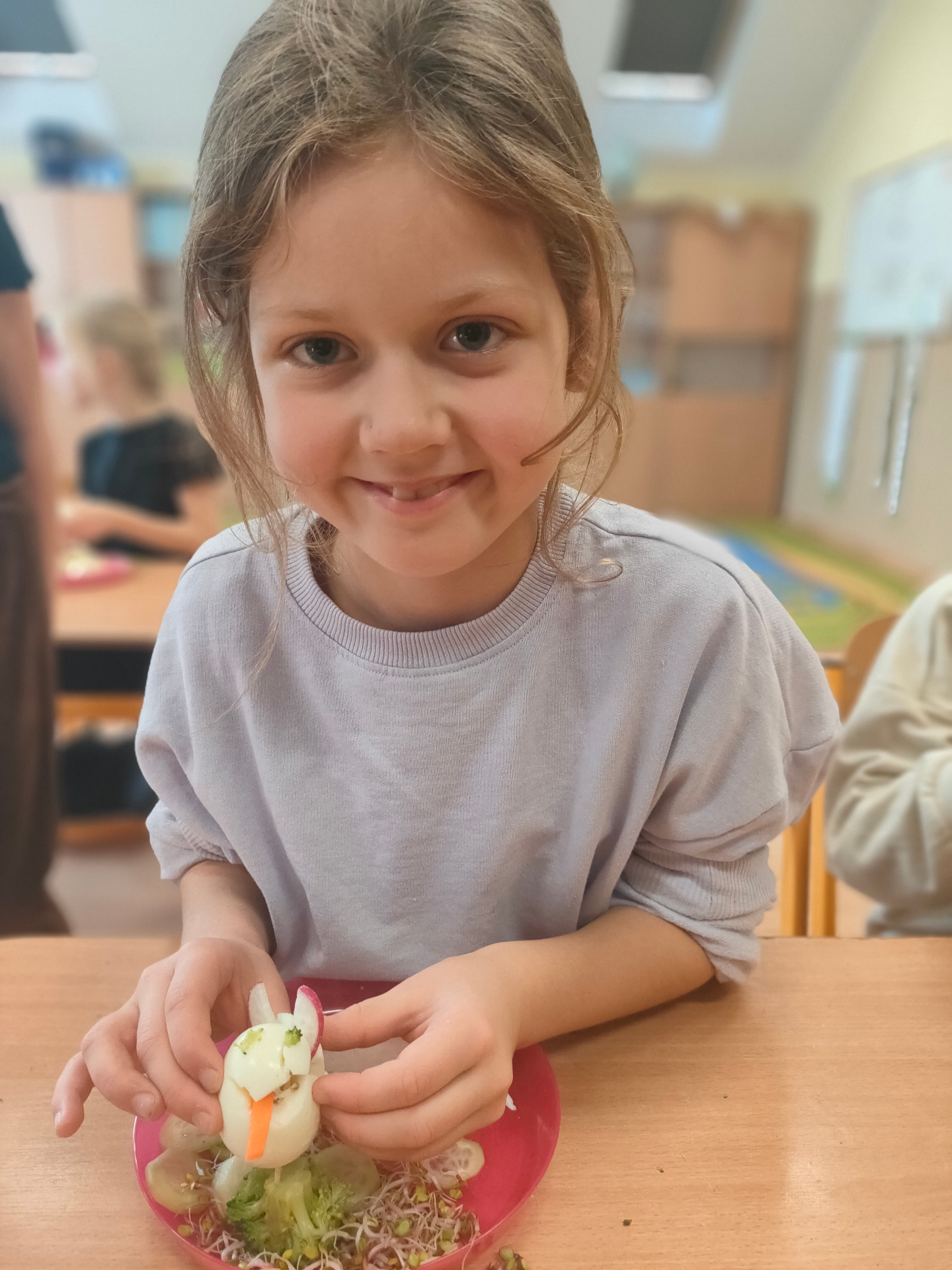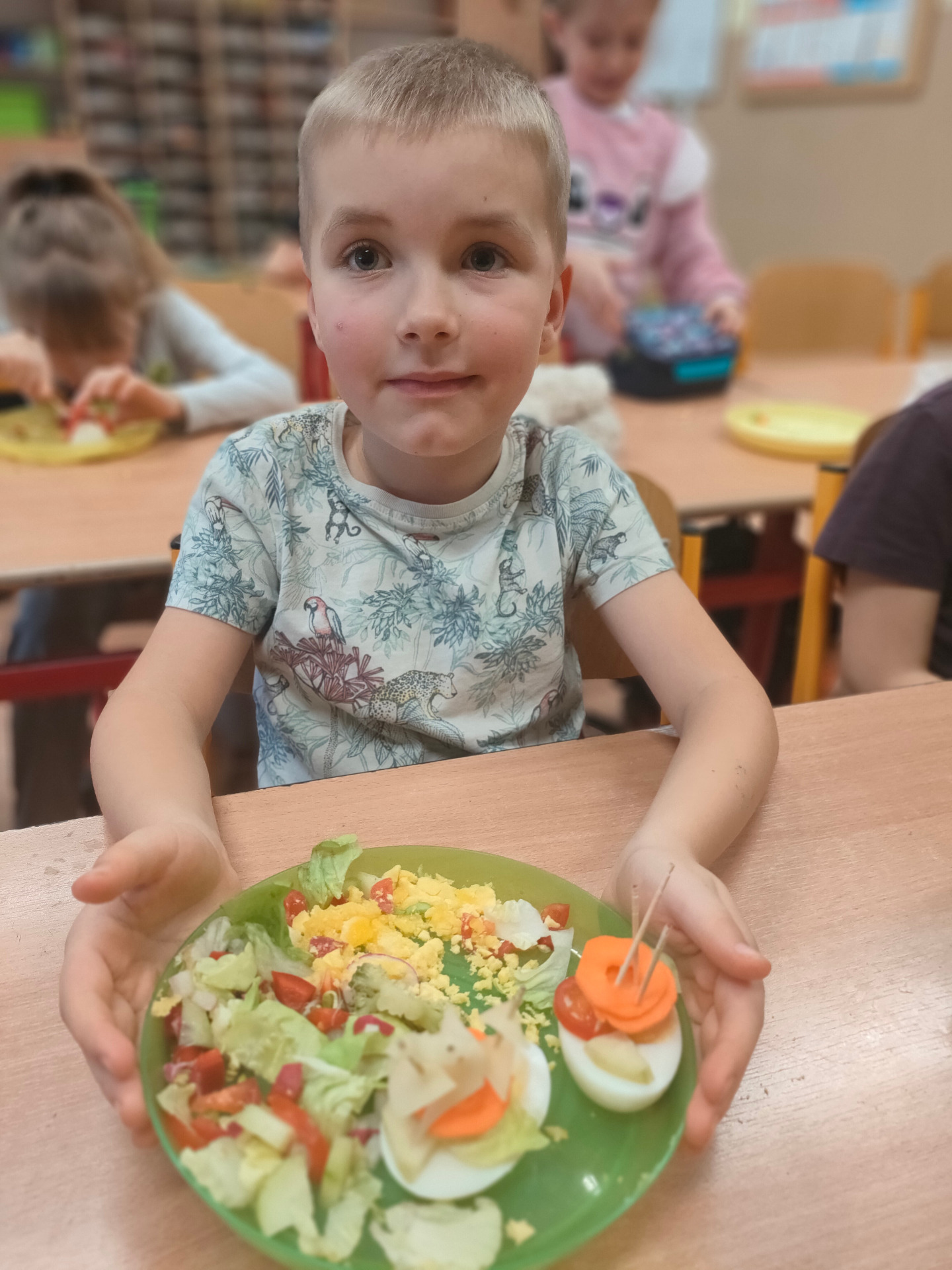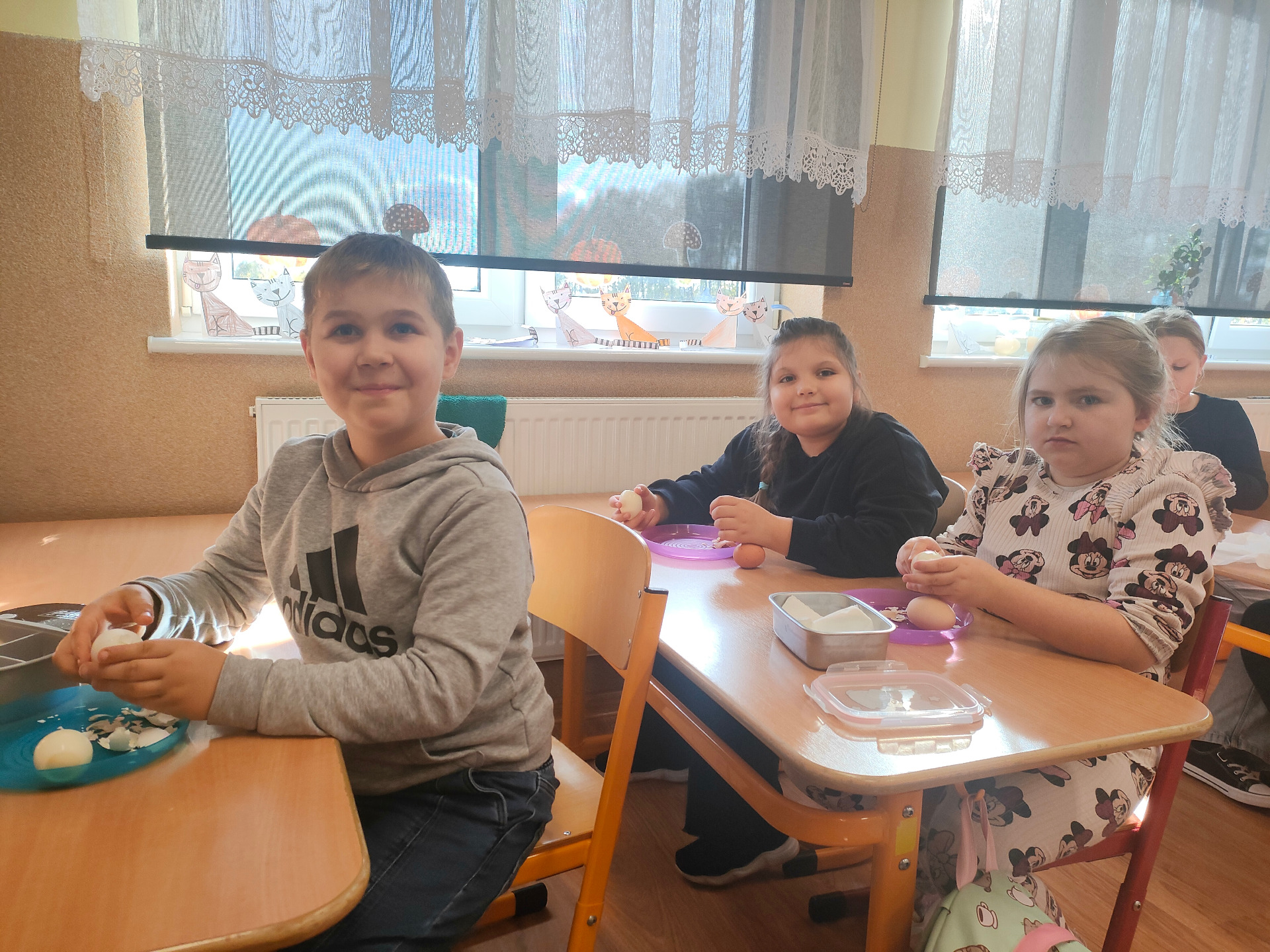 Uczniowie klasy 1 przygotowywali zdrowe i smaczne posiłki z wykorzystaniem jajek. Podczas zajęć dzieci dowiedziały się, dlaczego jajko jest tak cennym składnikiem naszej diety – zawiera bowiem wiele witamin, białko oraz składniki mineralne niezbędne do prawidłowego rozwoju. Po części teoretycznej przyszedł czas na twórcze działanie! Uczniowie przygotowali kolorowe przekąski z jajek, ozdabiając je warzywami. Z marchewek, pomidorów, ogórków, szczypiorku itp. powstały prawdziwe małe dzieła sztuki – zwierzątka, postacie i fantazyjne kompozycje.
