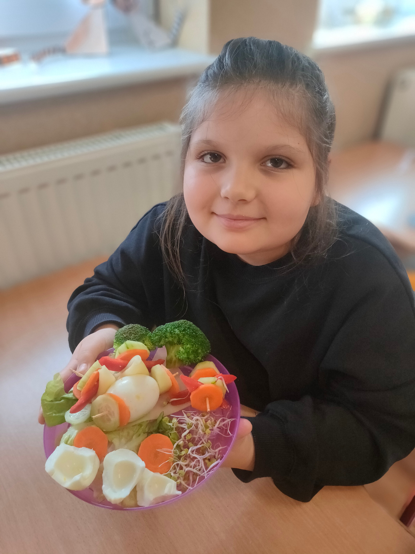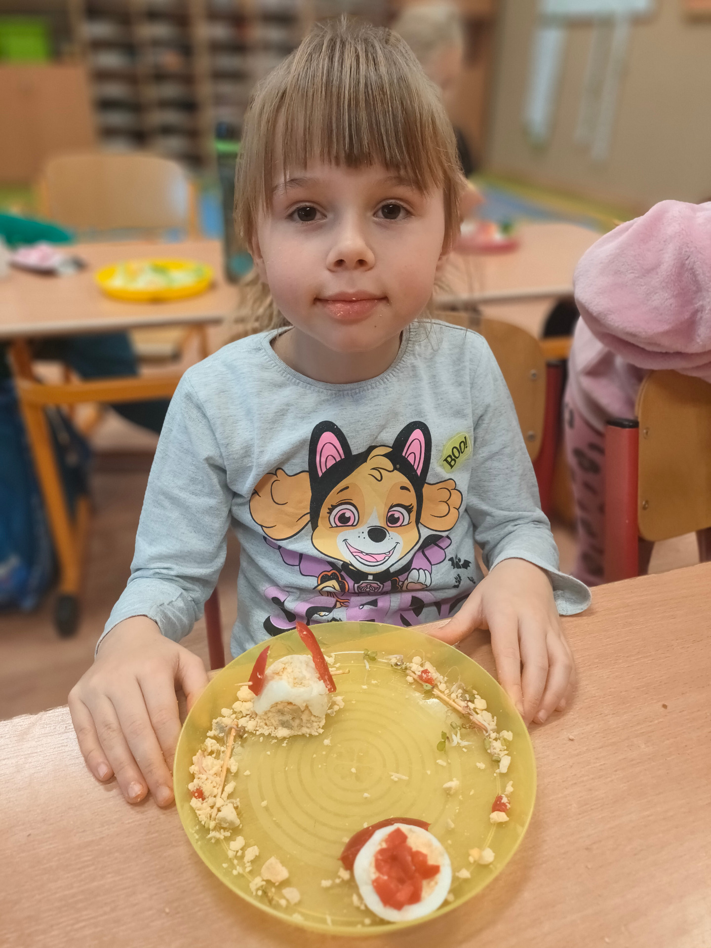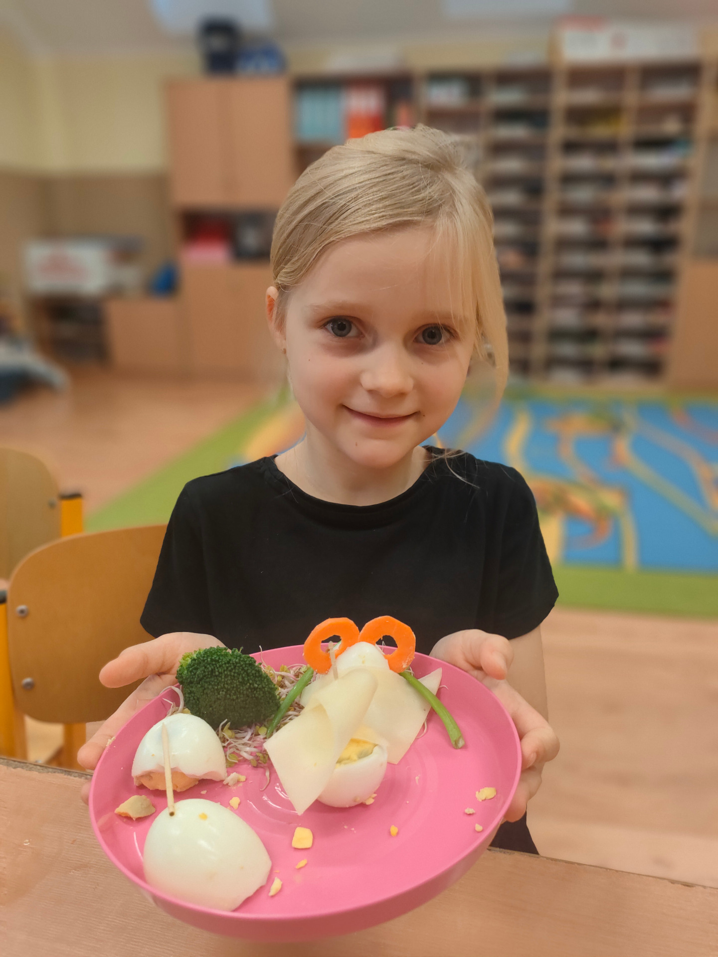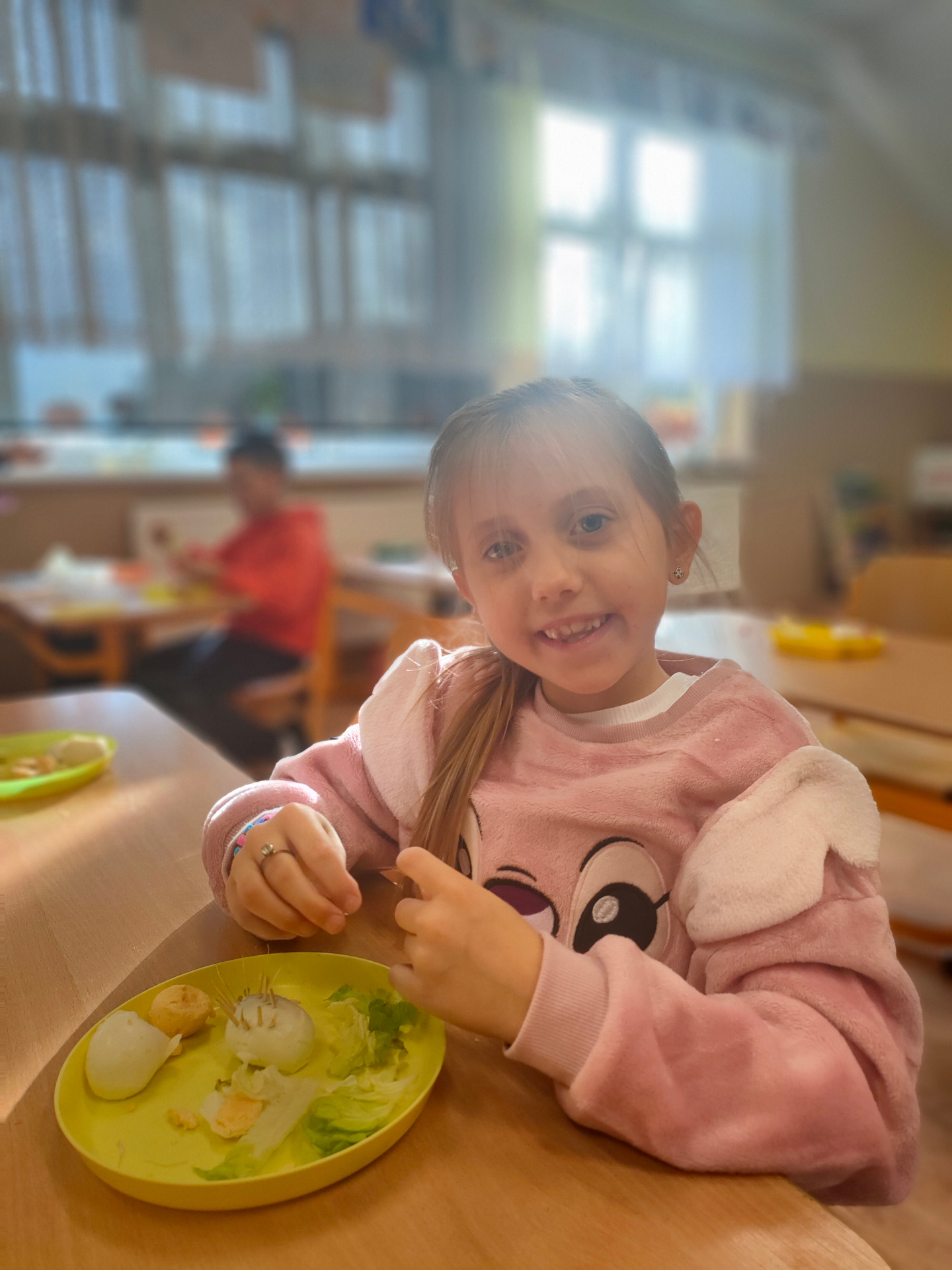 Uczniowie klasy 1 przygotowywali zdrowe i smaczne posiłki z wykorzystaniem jajek. Podczas zajęć dzieci dowiedziały się, dlaczego jajko jest tak cennym składnikiem naszej diety – zawiera bowiem wiele witamin, białko oraz składniki mineralne niezbędne do prawidłowego rozwoju. Po części teoretycznej przyszedł czas na twórcze działanie! Uczniowie przygotowali kolorowe przekąski z jajek, ozdabiając je warzywami. Z marchewek, pomidorów, ogórków, szczypiorku itp. powstały prawdziwe małe dzieła sztuki – zwierzątka, postacie i fantazyjne kompozycje.