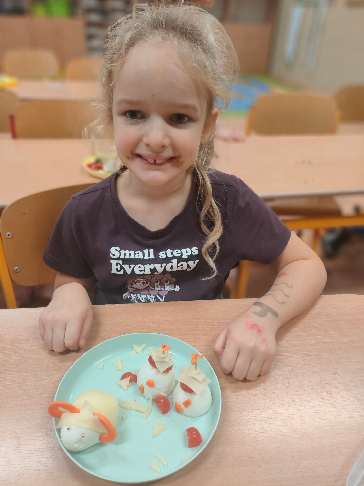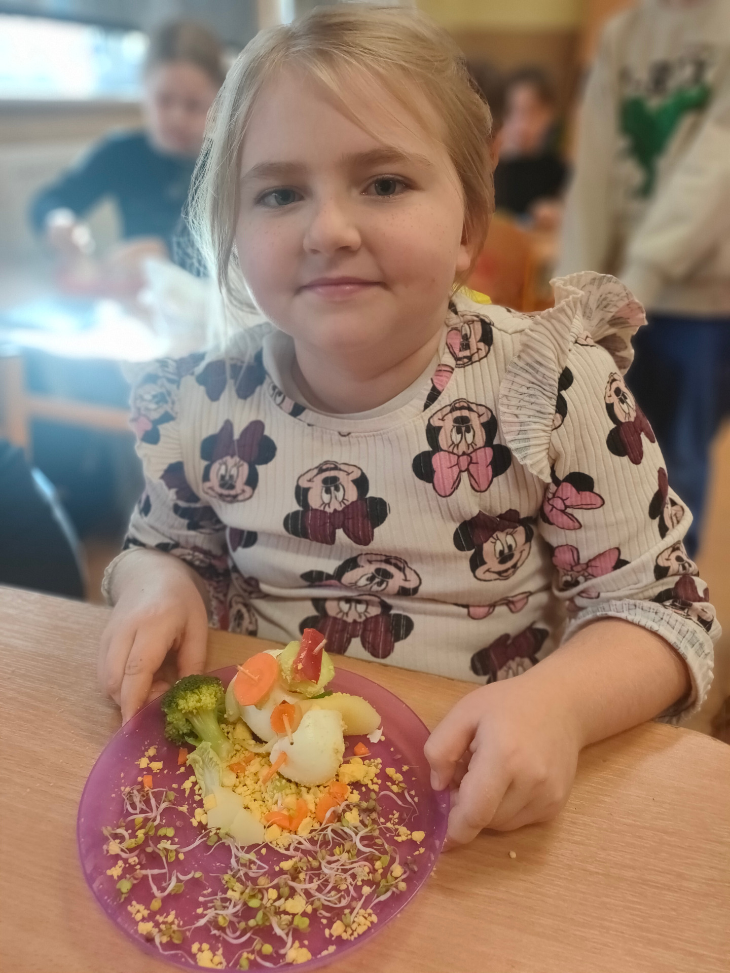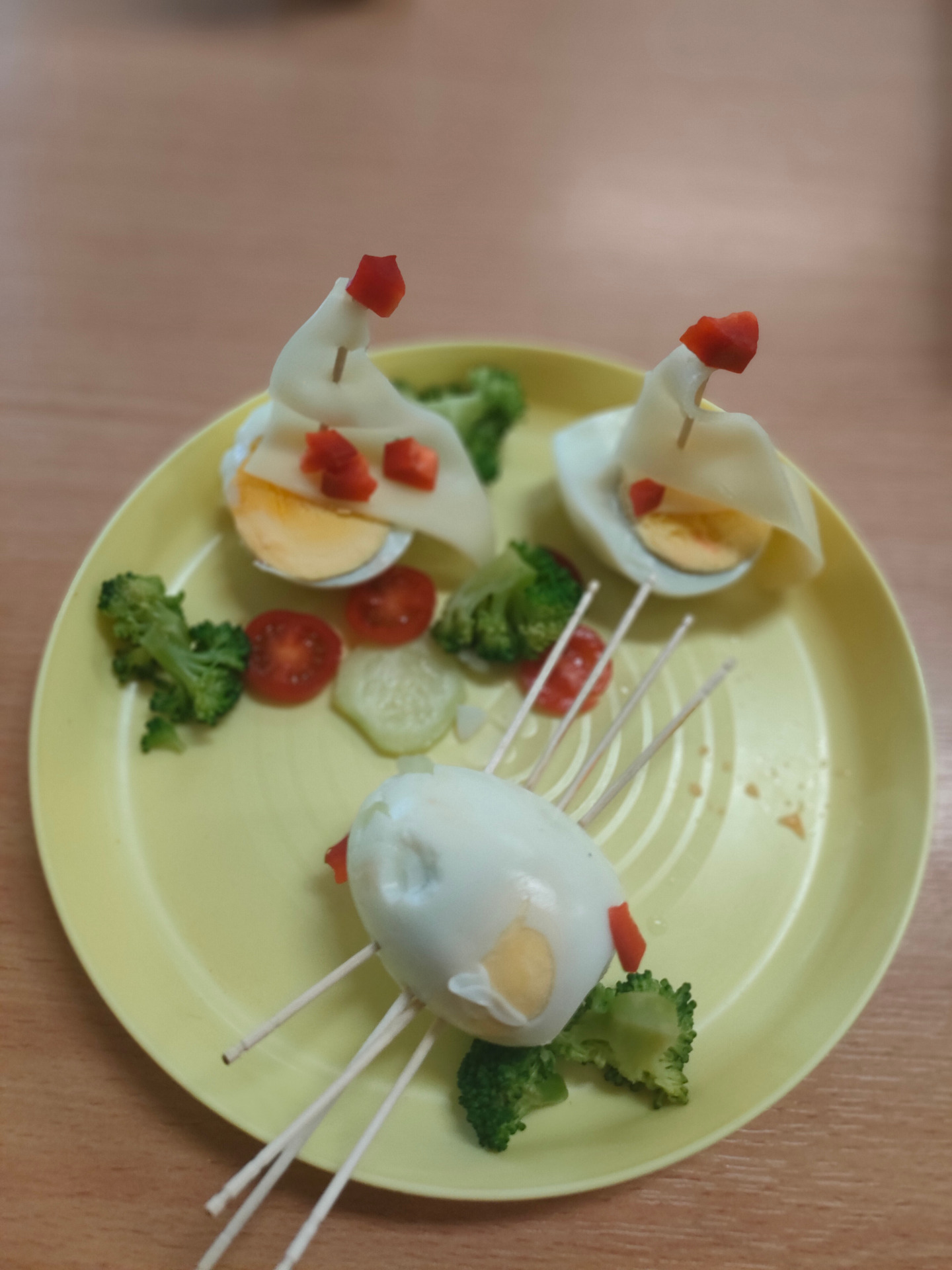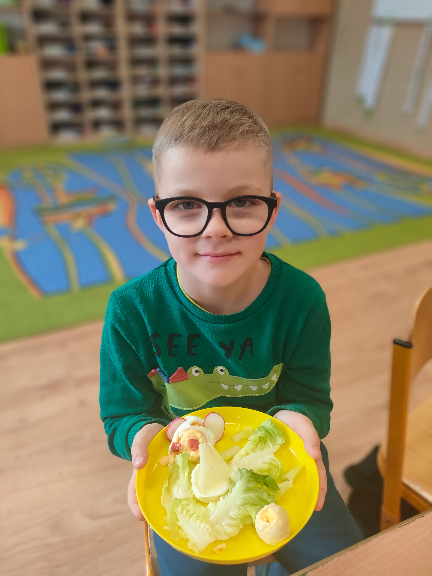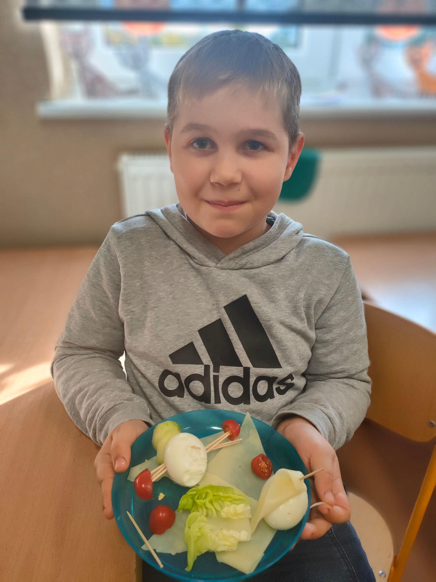 Uczniowie klasy 1 przygotowywali zdrowe i smaczne posiłki z wykorzystaniem jajek. Podczas zajęć dzieci dowiedziały się, dlaczego jajko jest tak cennym składnikiem naszej diety – zawiera bowiem wiele witamin, białko oraz składniki mineralne niezbędne do prawidłowego rozwoju. Po części teoretycznej przyszedł czas na twórcze działanie! Uczniowie przygotowali kolorowe przekąski z jajek, ozdabiając je warzywami. Z marchewek, pomidorów, ogórków, szczypiorku itp. powstały prawdziwe małe dzieła sztuki – zwierzątka, postacie i fantazyjne kompozycje.