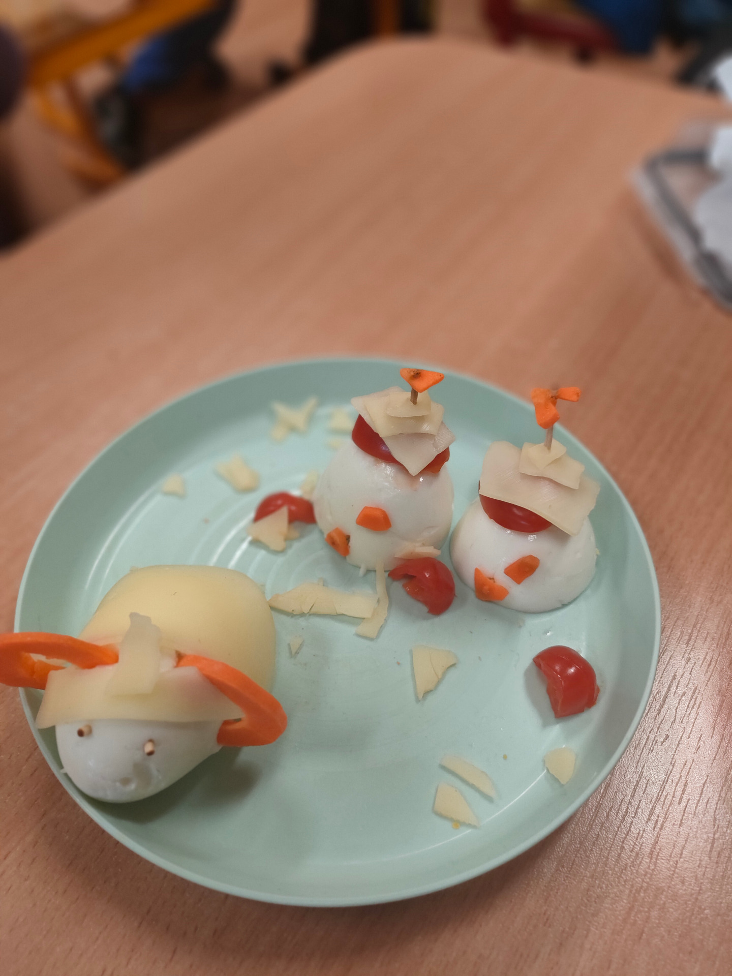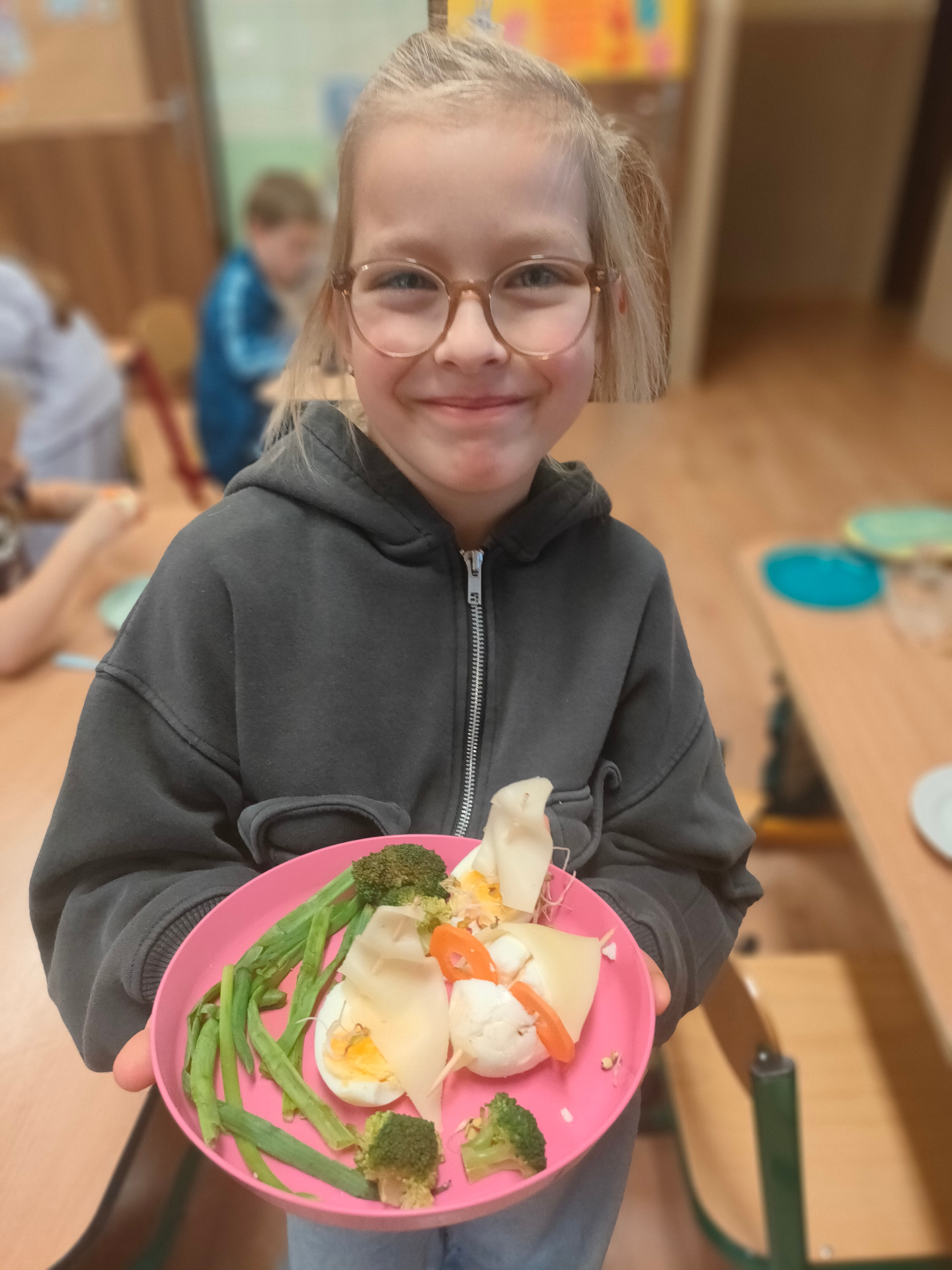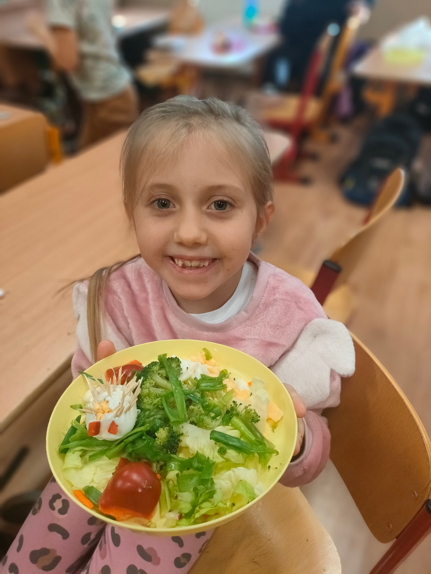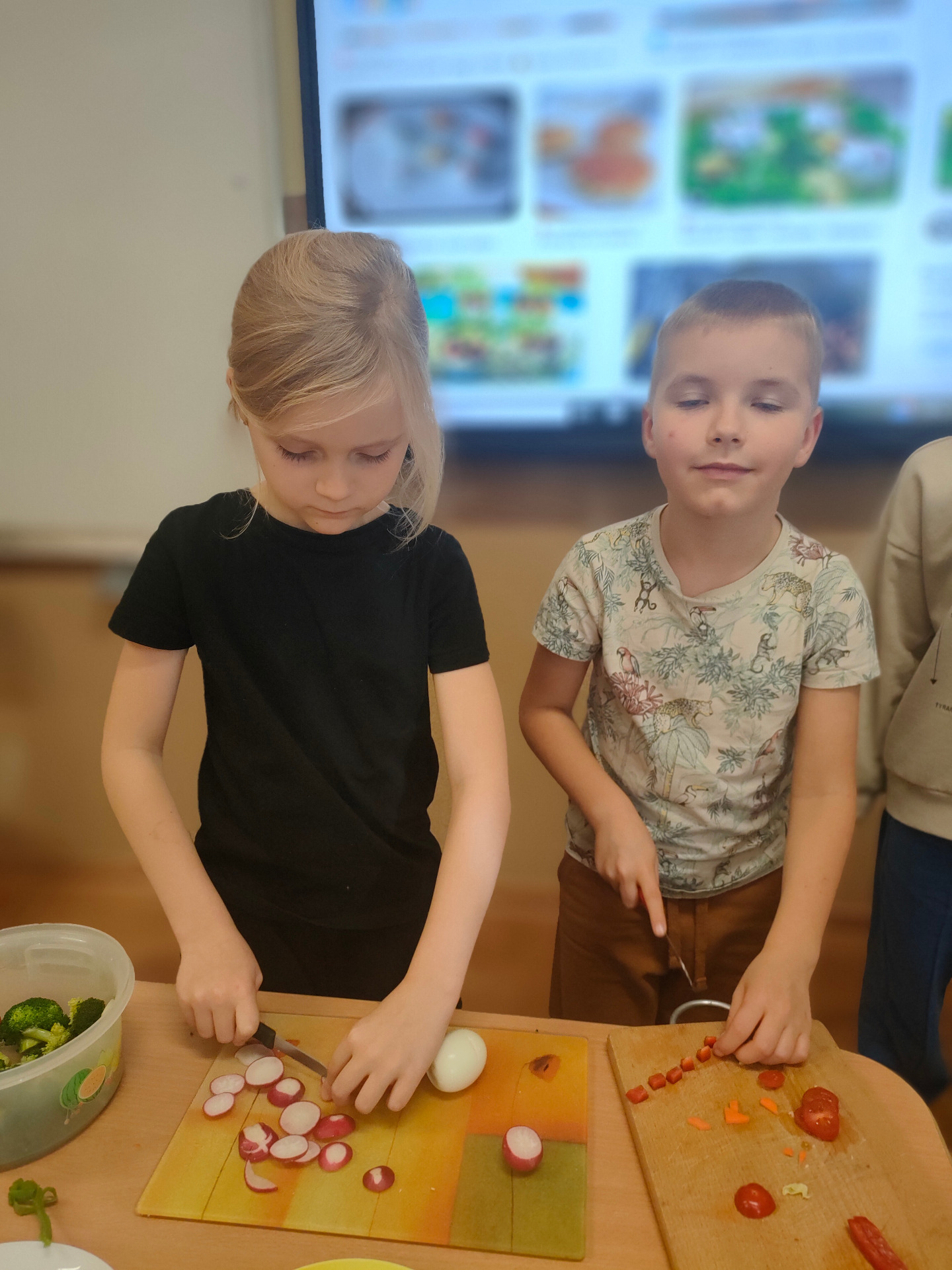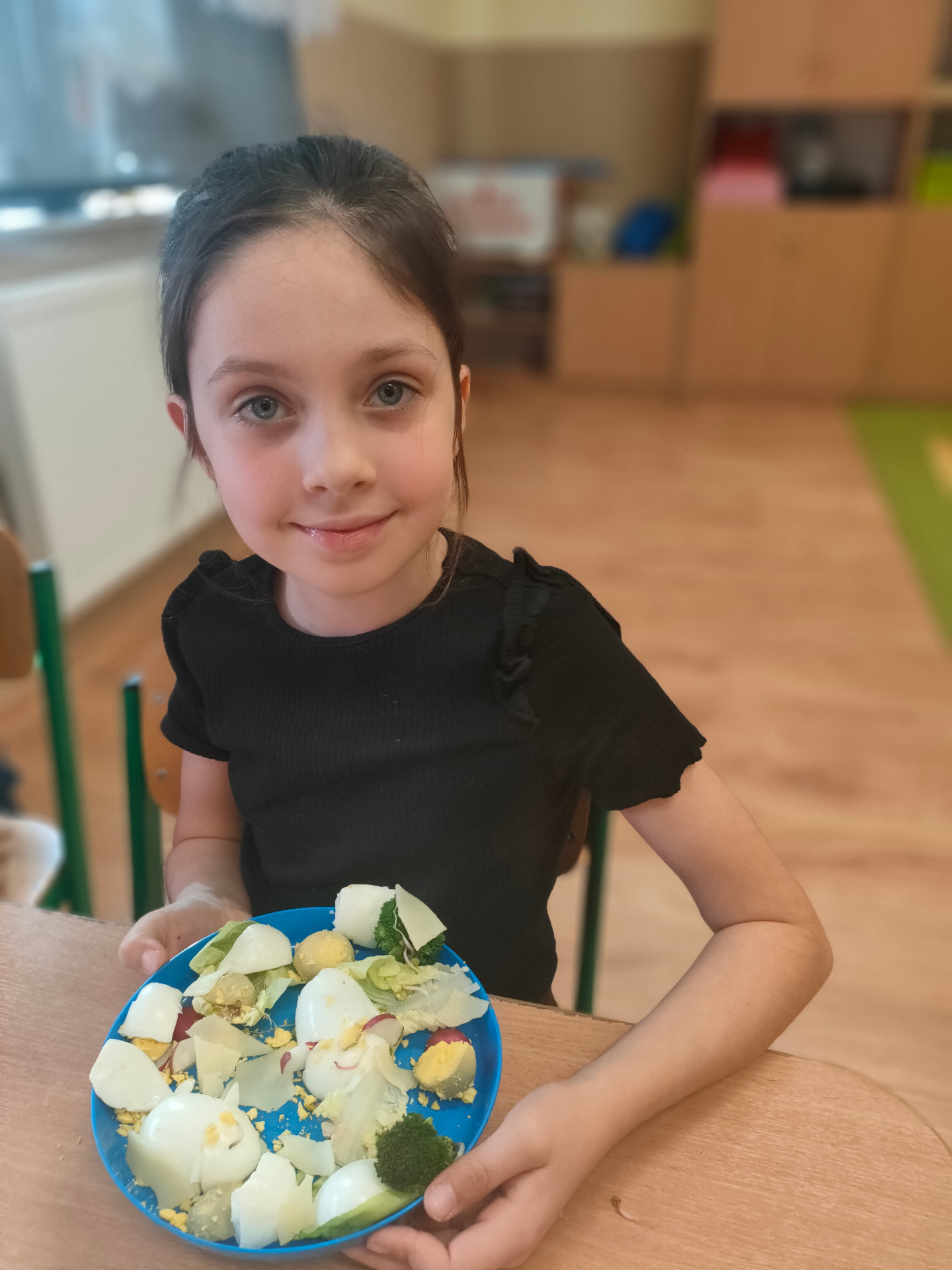 Uczniowie klasy 1 przygotowywali zdrowe i smaczne posiłki z wykorzystaniem jajek. Podczas zajęć dzieci dowiedziały się, dlaczego jajko jest tak cennym składnikiem naszej diety – zawiera bowiem wiele witamin, białko oraz składniki mineralne niezbędne do prawidłowego rozwoju. Po części teoretycznej przyszedł czas na twórcze działanie! Uczniowie przygotowali kolorowe przekąski z jajek, ozdabiając je warzywami. Z marchewek, pomidorów, ogórków, szczypiorku itp. powstały prawdziwe małe dzieła sztuki – zwierzątka, postacie i fantazyjne kompozycje.