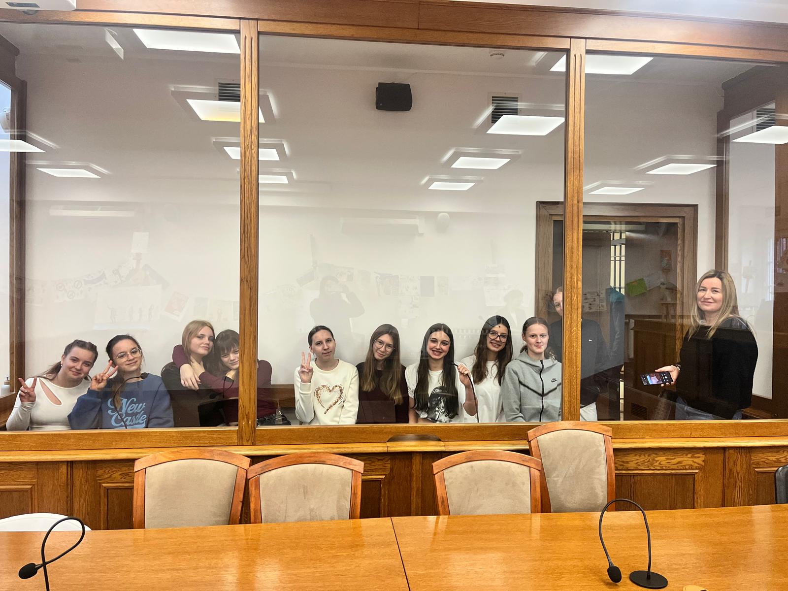 Po przybyciu na miejsce grupa została powitana przez p. Prezes Sądu sędzię Krystynę Lemańczyk-Brzoskowską, która zaprosiła nas na salę rozpraw. Krótko zostały omówione zadania osób uczestniczących w postępowaniu sądowym: sędziego, prokuratora, adwokata, protokolanta oraz kuratora sądowego.