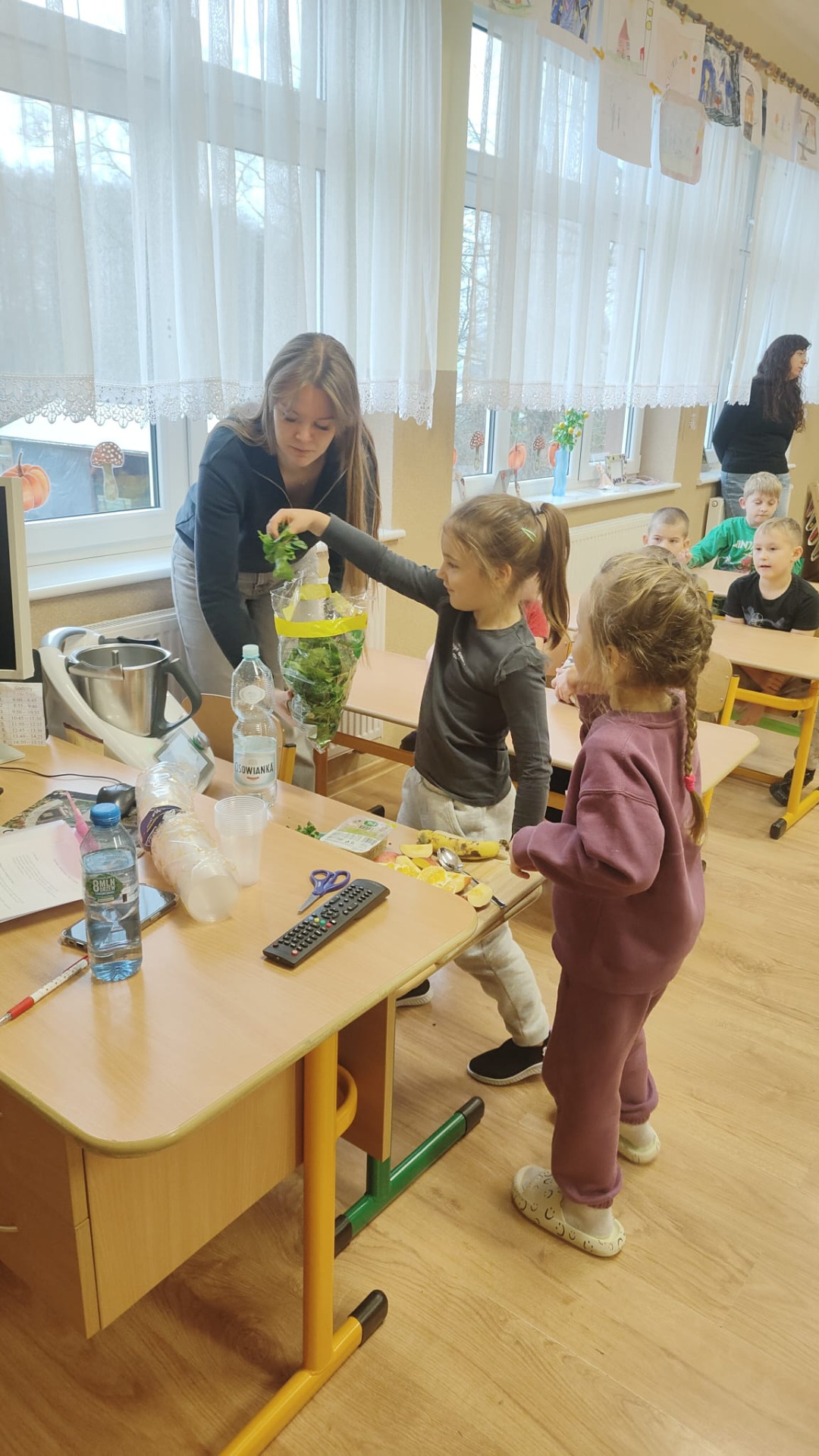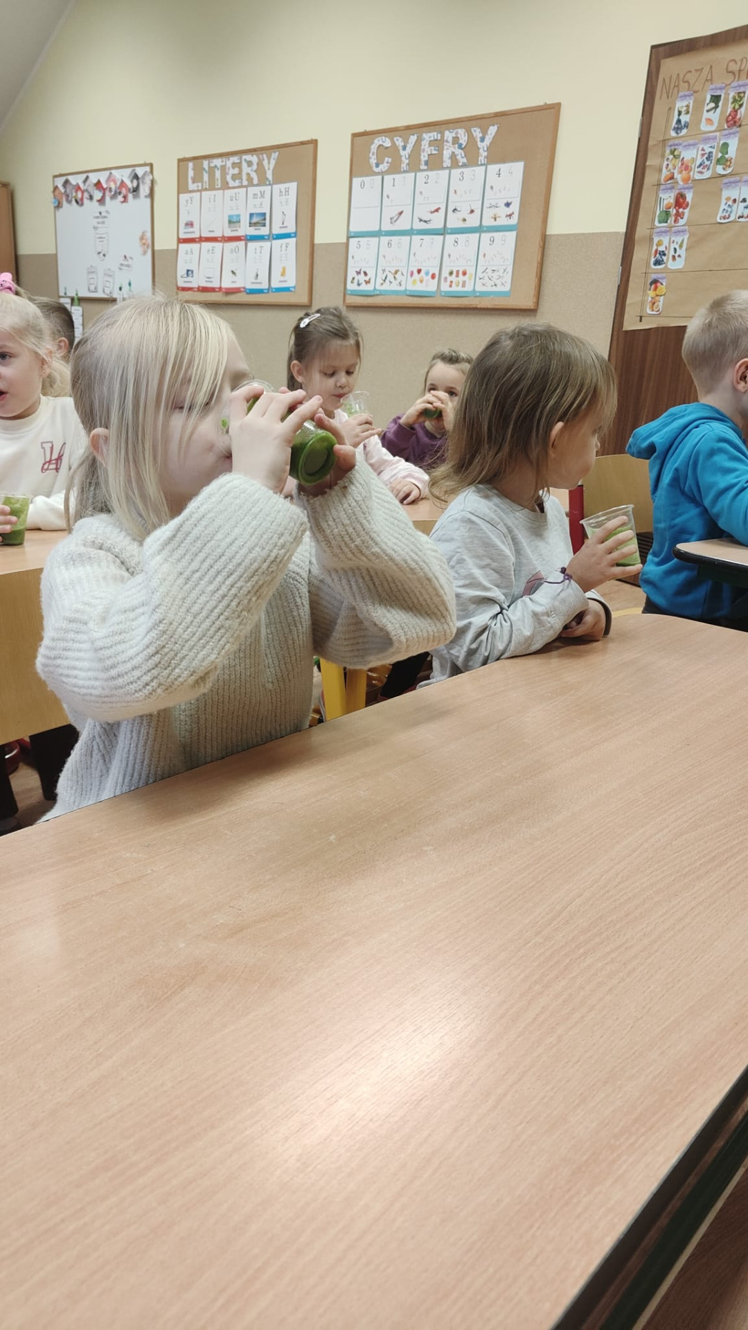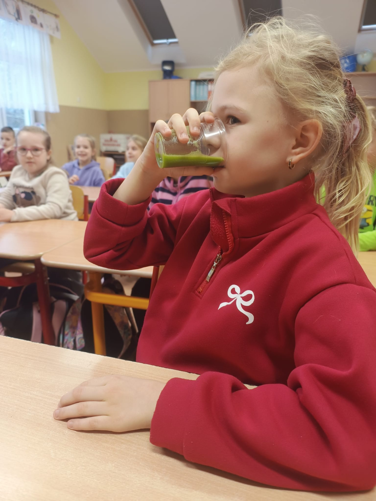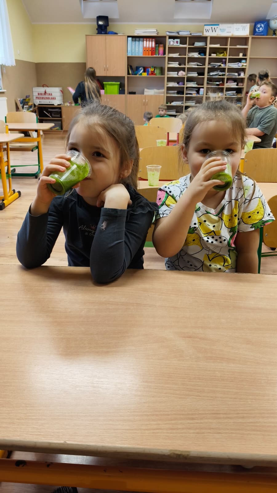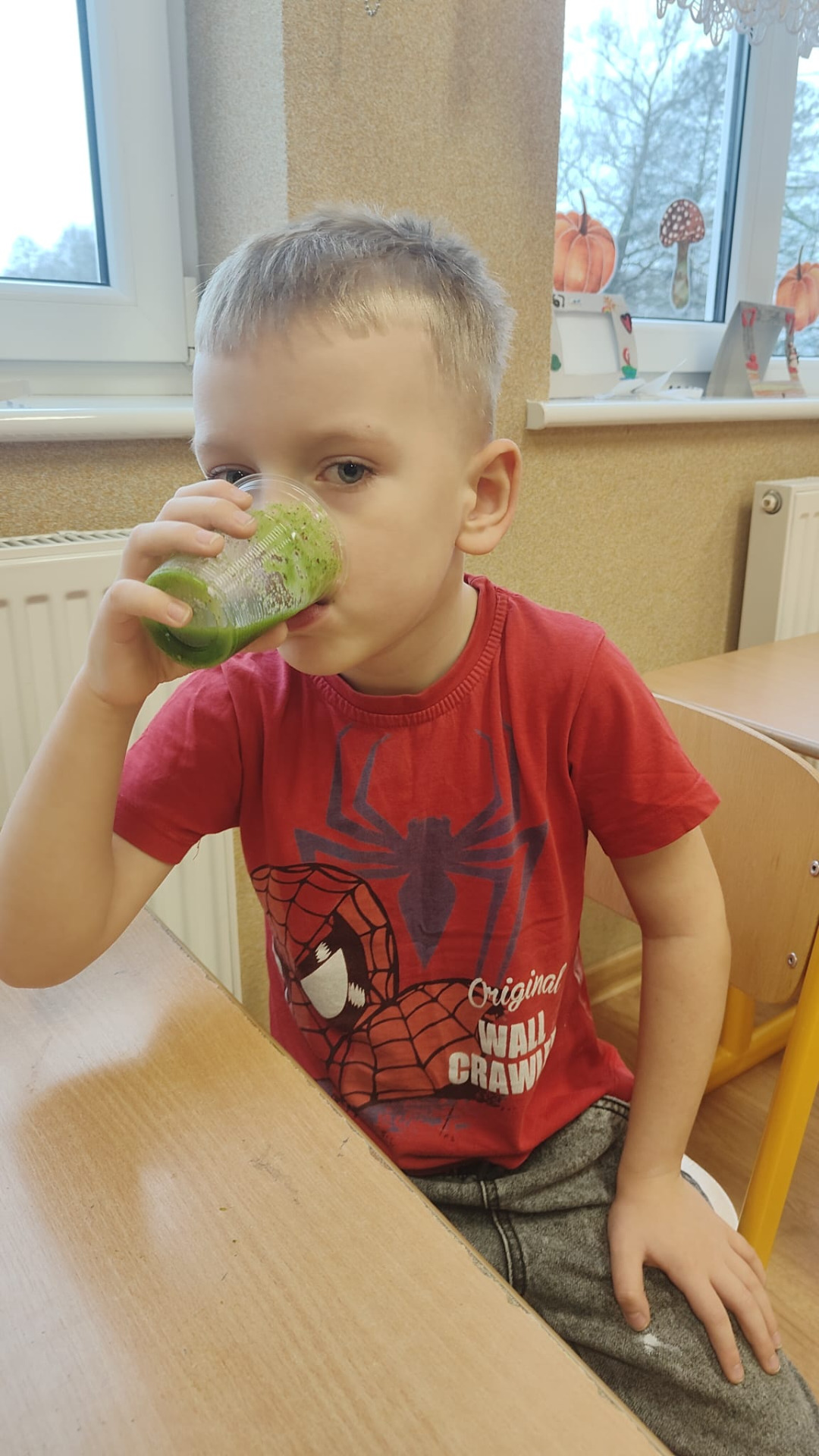 W części praktycznej uczniowie mieli okazję wspólnie przygotować zdrowy koktajl „Shreka” – zielony, pełen witamin i bardzo smaczny. Dzieci chętnie uczestniczyły w przygotowaniach, a efekt końcowy wzbudził dużo radości i zachęcił do próbowania nowych smaków.