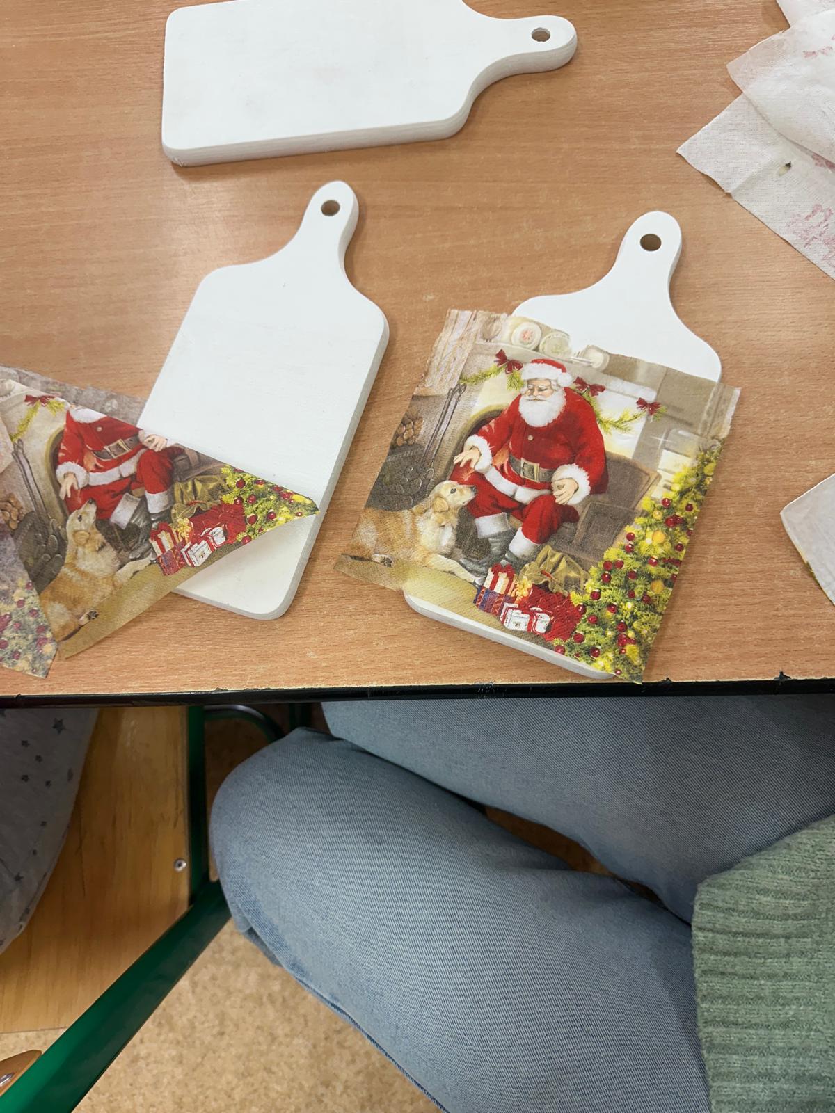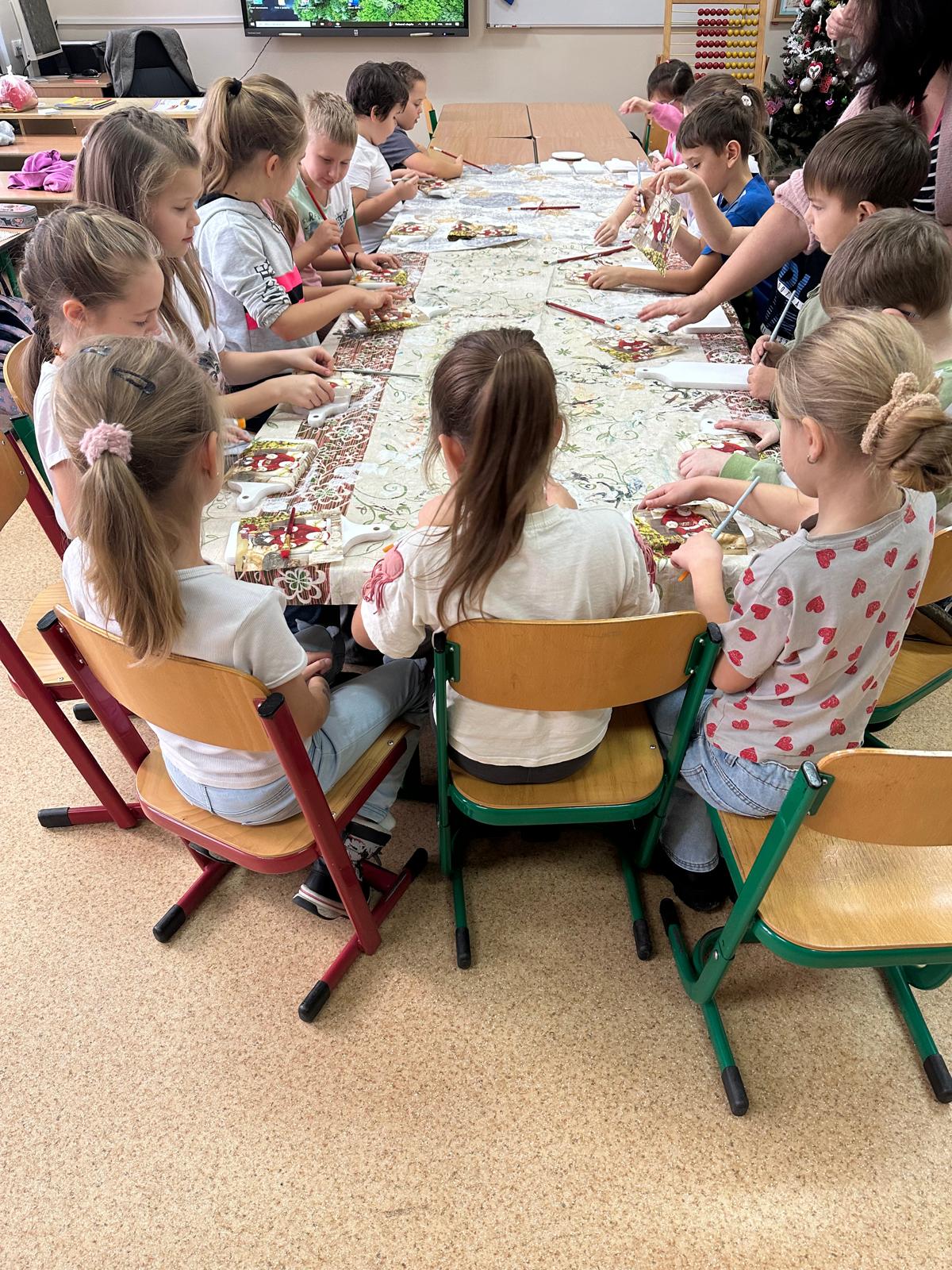 We wtorek, 9 grudnia br. w klasie drugiej odbyły się wyjątkowe warsztaty plastyczne, podczas których uczniowie własnoręcznie ozdabiali drewniane deski do krojenia techniką decoupage. Dzieci malowały, komponowały świąteczne wzory i tworzyły niepowtarzalne dekoracje, wprowadzając się w radosny nastrój Świąt Bożego Narodzenia.