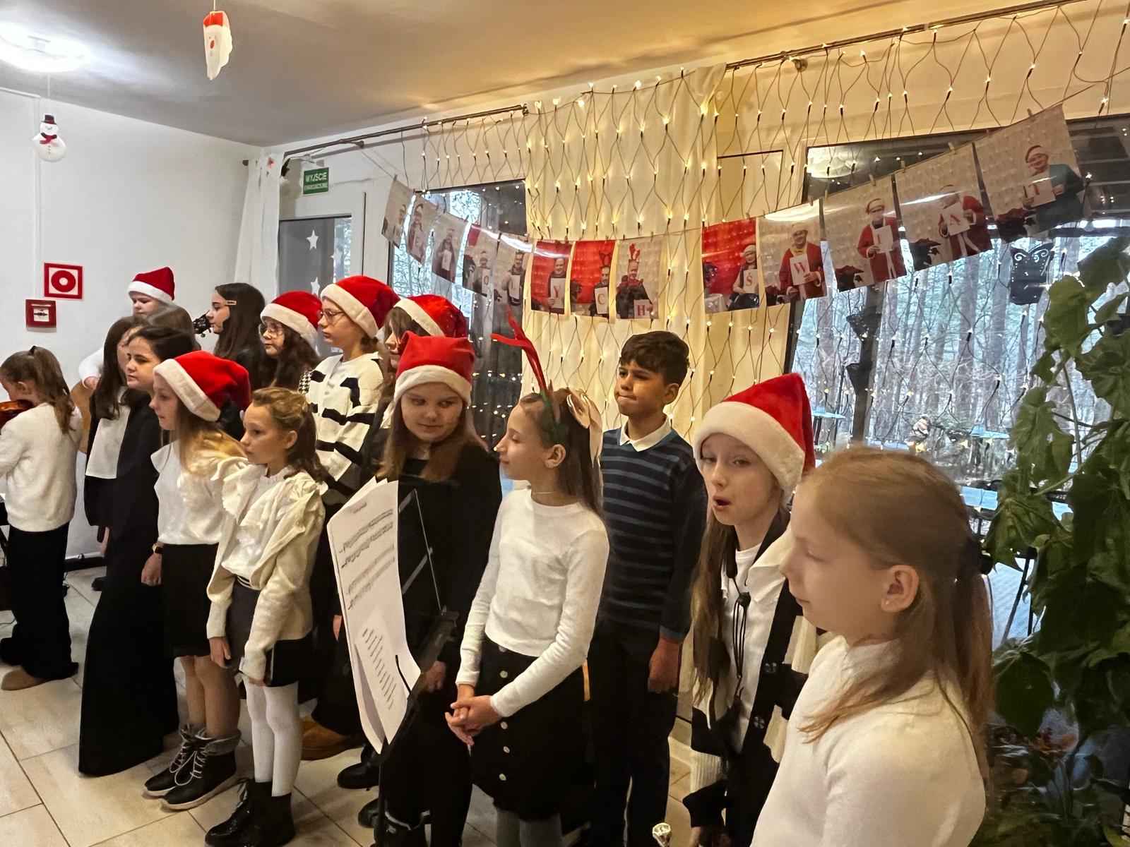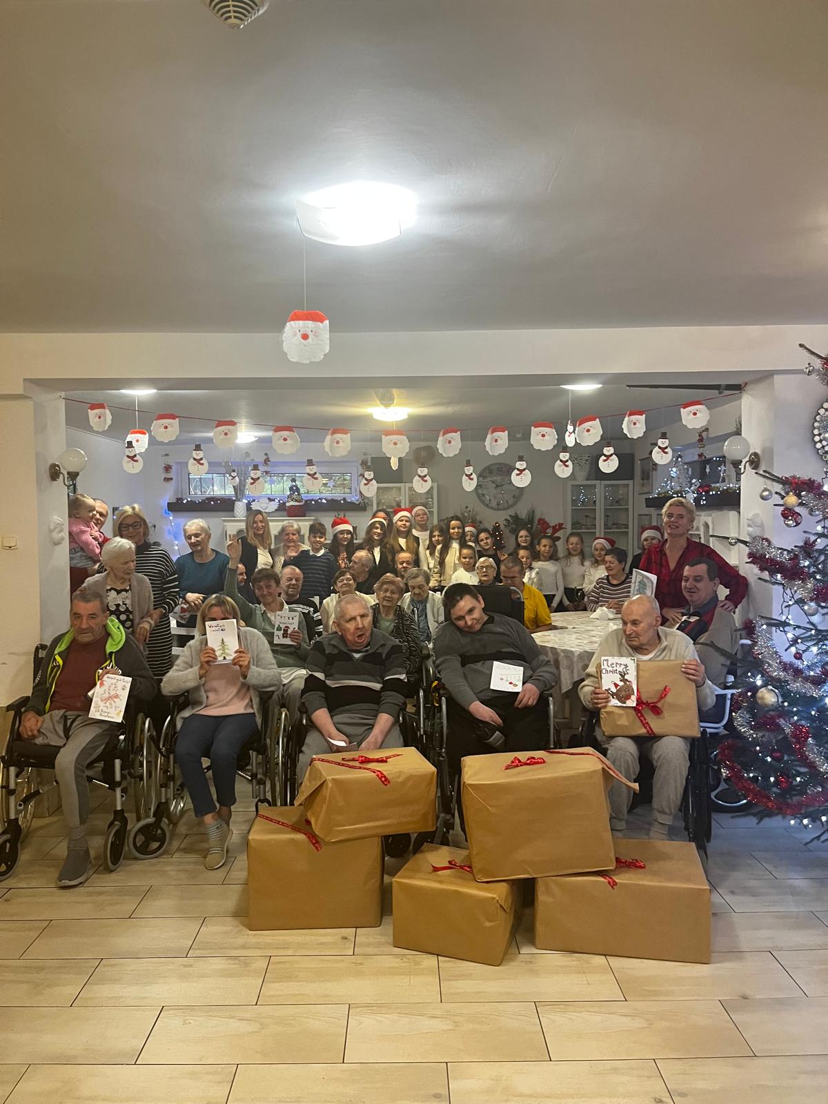 Po przybyciu na miejsce chór zaprezentował przygotowany wcześniej repertuar kolęd i piosenek świątecznych. Występ został bardzo ciepło przyjęty przez mieszkańców DPS, którzy chętnie włączali się we wspólne śpiewanie. Atmosfera spotkania była serdeczna i wzruszająca. Po części artystycznej uczniowie przekazali mieszkańcom Domu Pomocy Społecznej paczki świąteczne zawierające słodycze, kawę, herbatę kartki z życzeniami oraz drobne upominki. Podarunki sprawiły wiele radości.