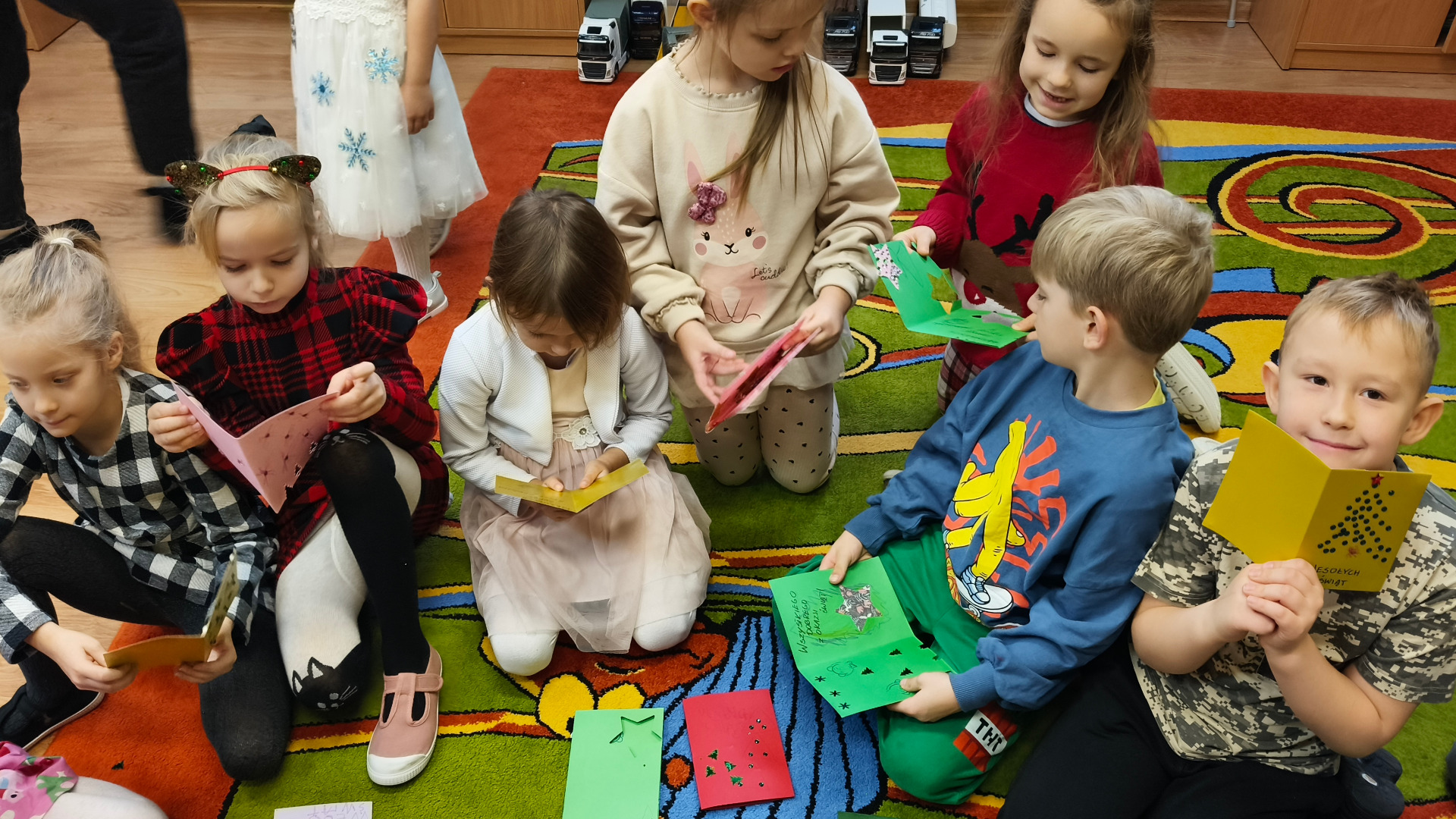 W okresie przedświątecznym nasze przedszkole wzięło udział w wymianie pocztówkowej z Przedszkolem „MIŚ” w Kościerzynie. W ramach tego przedsięwzięcia otrzymaliśmy piękne kartki bożonarodzeniowe z ciepłymi, świątecznymi życzeniami, które sprawiły nam wiele radości. W ramach rewanżu grupy „0” z naszego przedszkola przygotowały własnoręcznie wykonane kartki świąteczne, które następnie zostały odesłane do Kościerzyny wraz z serdecznymi życzeniami dla tamtejszych przedszkolaków.